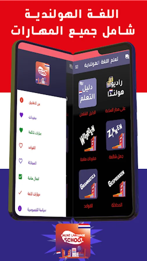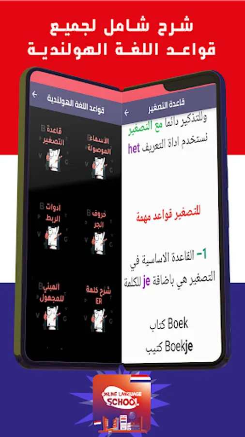 First: The grammar of the Dutch language in full, with audio and video, under the supervision of specialized professors with experience and long experience in teaching the Dutch language, which starts with you from letters and simple information to mastering the rules completely within several levels arranged in a planned and organized manner with complete translation in addition to the most important notes and useful conclusions
