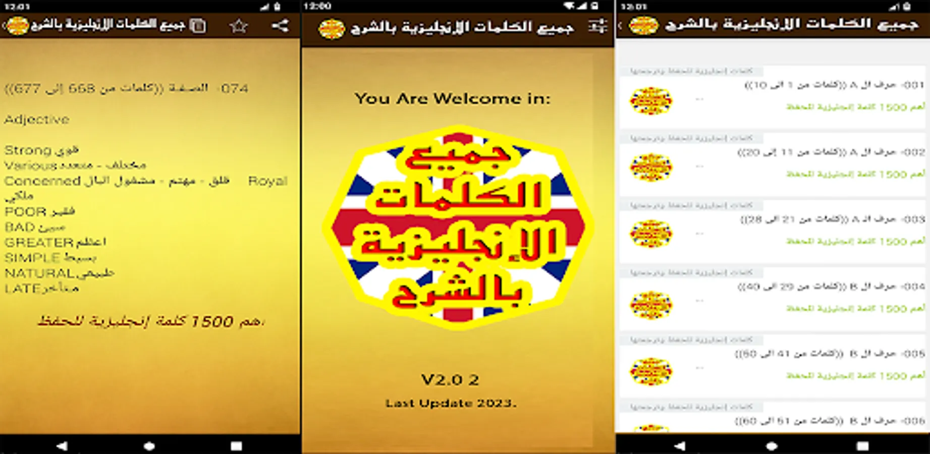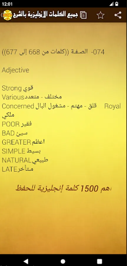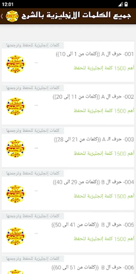 You can choose any classification and read all the words that begin with that letter with an explanation of it in Arabic.