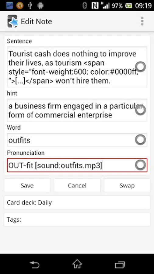 Sound Basket: Every time you play a pronunciation link, it will be stored in the basket. After you played many, all of them will be copied to the card. If you don't want all of them, open the Sound Basket from the menu. You can toggle the selection by a click and play it by a long click.