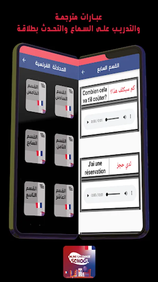 Fourth: French conversations in all fields, which are hundreds of multiple dialogues in audio and video between people in different areas of life and for all topics used in daily life