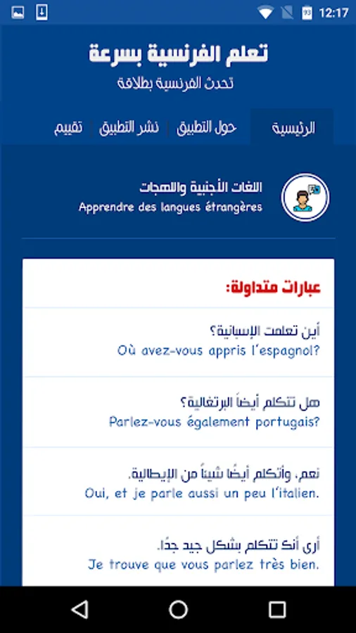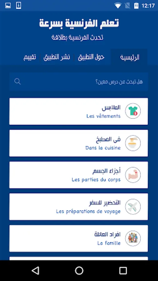 The application of learning French quickly provides you with a variety of lessons in the French language translated into Arabic, these lessons will enable you to learn the French language in a short time and quickly from start to mastery.