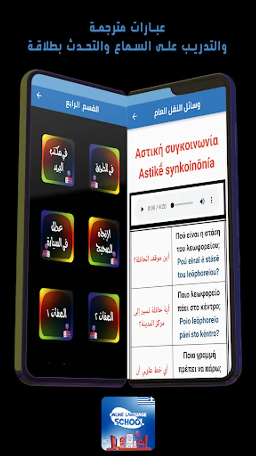 Fourth: Greek conversations in all fields, which are hundreds of multiple dialogues with audio and video between people in different areas of life and for all topics used in daily life