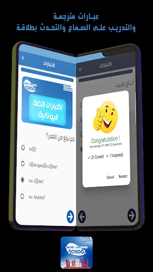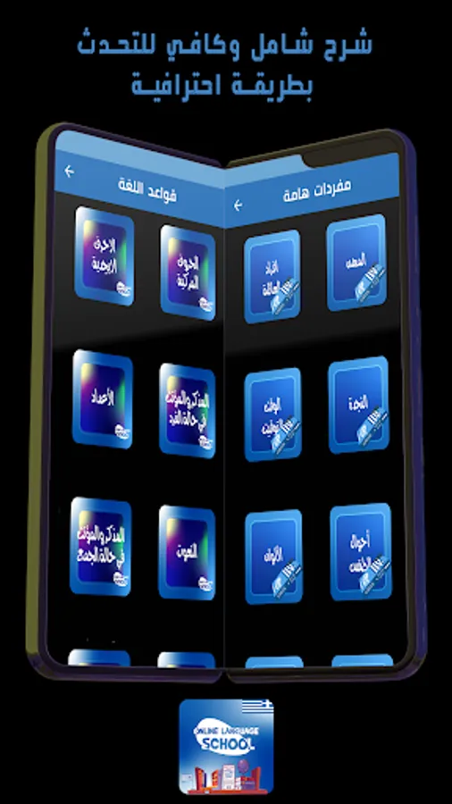 First: The grammar of the Greek language in full, with audio and video, under the supervision of specialized professors with experience and a long experience in teaching the Greek language, which starts with you from letters and simple information to mastering the rules completely within several levels arranged in a planned and organized manner with complete translation in addition to the most important notes and useful conclusions