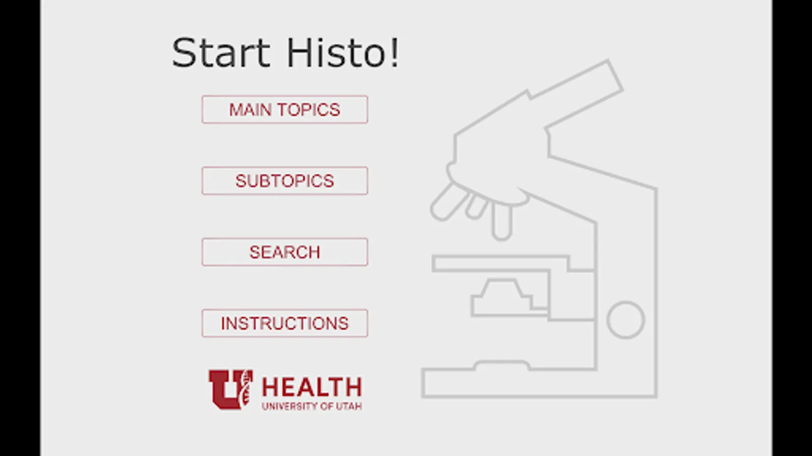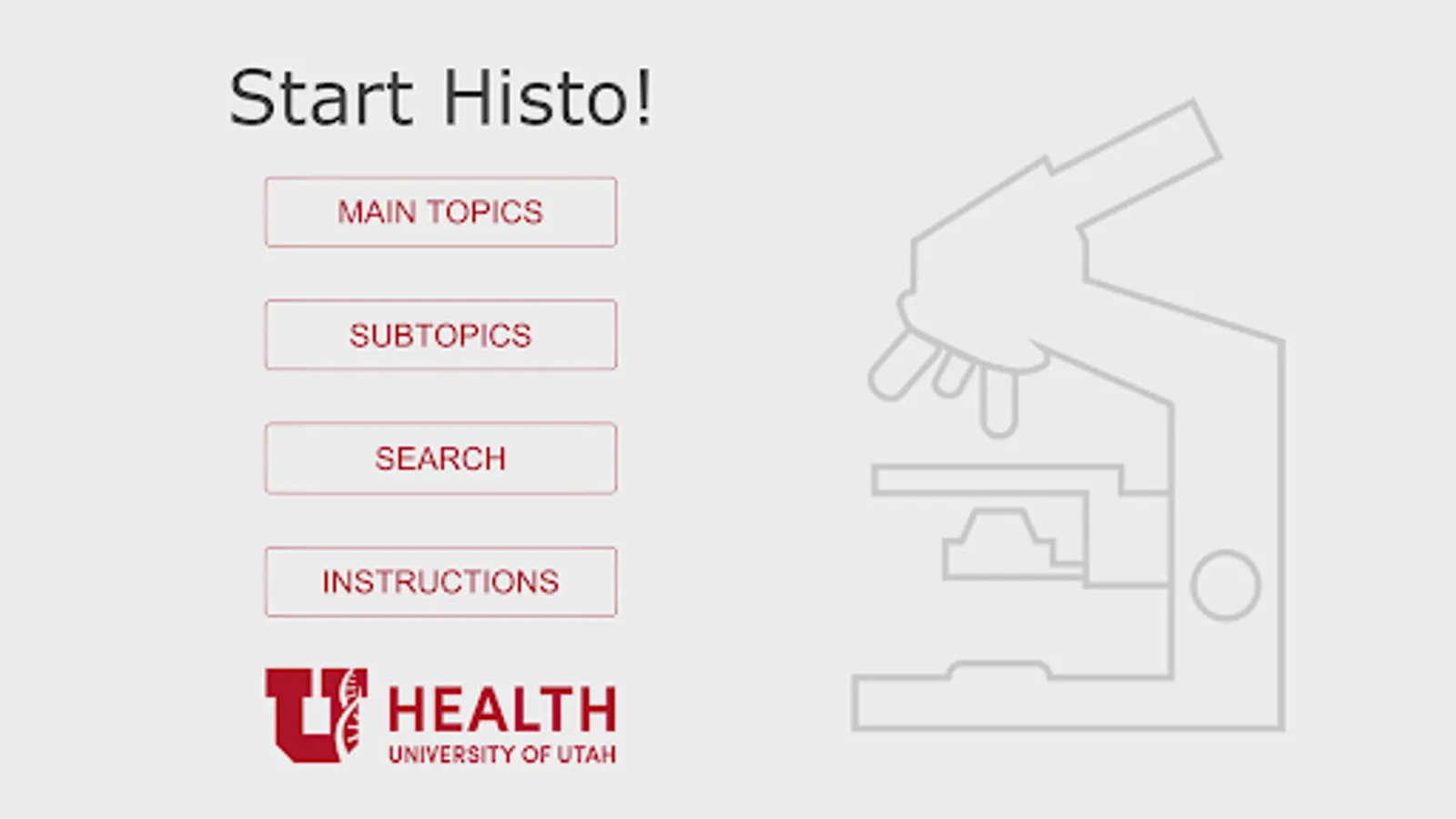 Histo! is the favorite study aid of medical and dental students in histology courses at the University of Utah. It currently contains 2179 identification slides, based on 547 photomicrographic images. The slides are organized into 19 Main Topics and 148 Subtopics. In addition, every slide is associated with one or more of 675 Search terms. The ability to choose between Main Topics, Subtopics, or Search terms allows you to focus your study as broadly or sharply as you wish. An internet connection is not required.