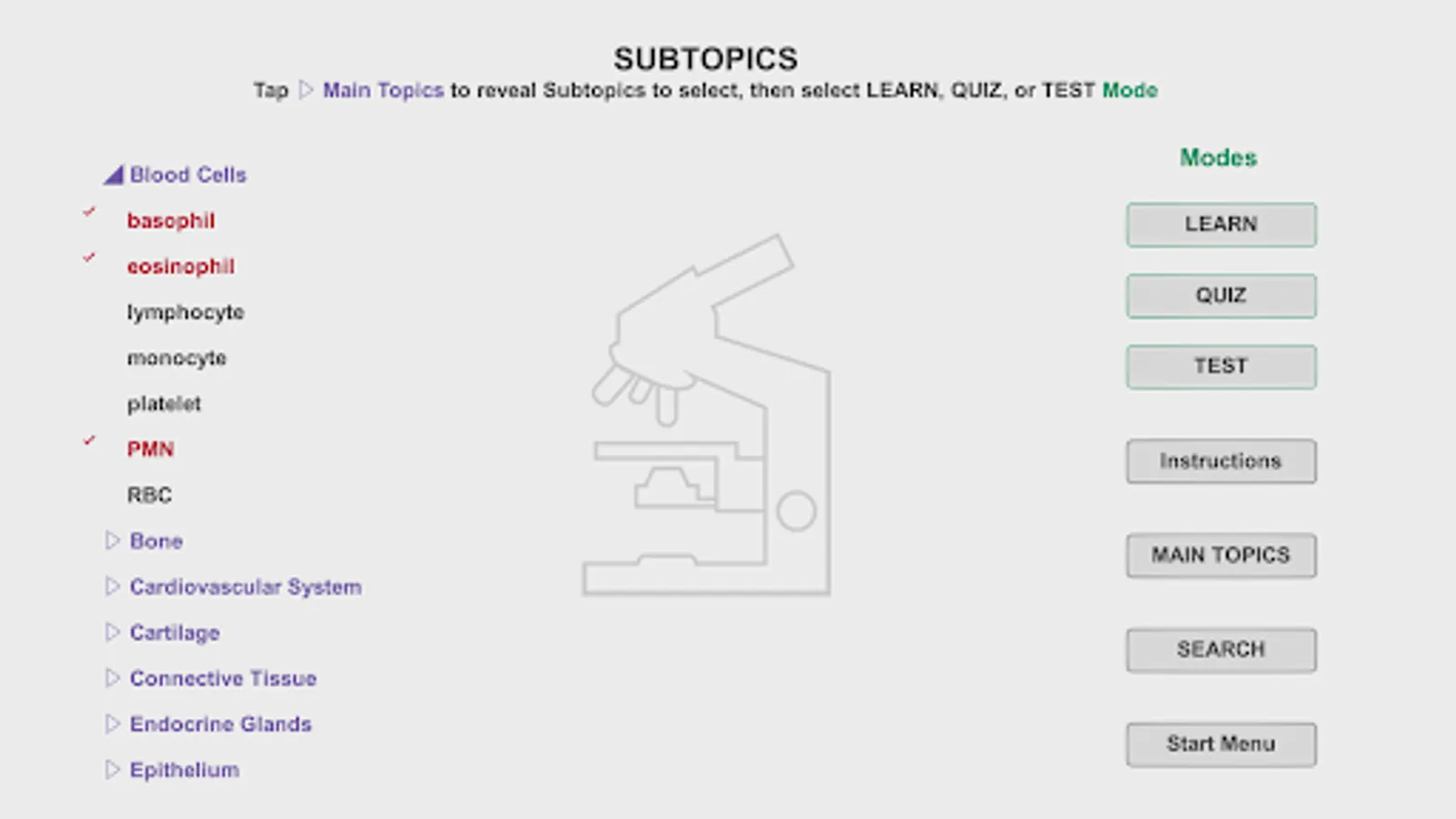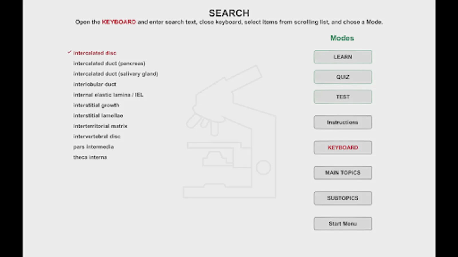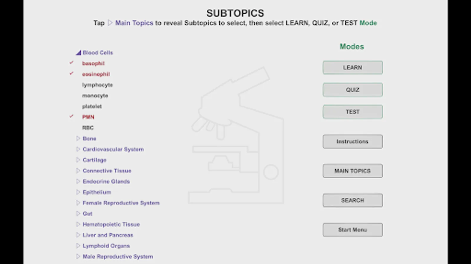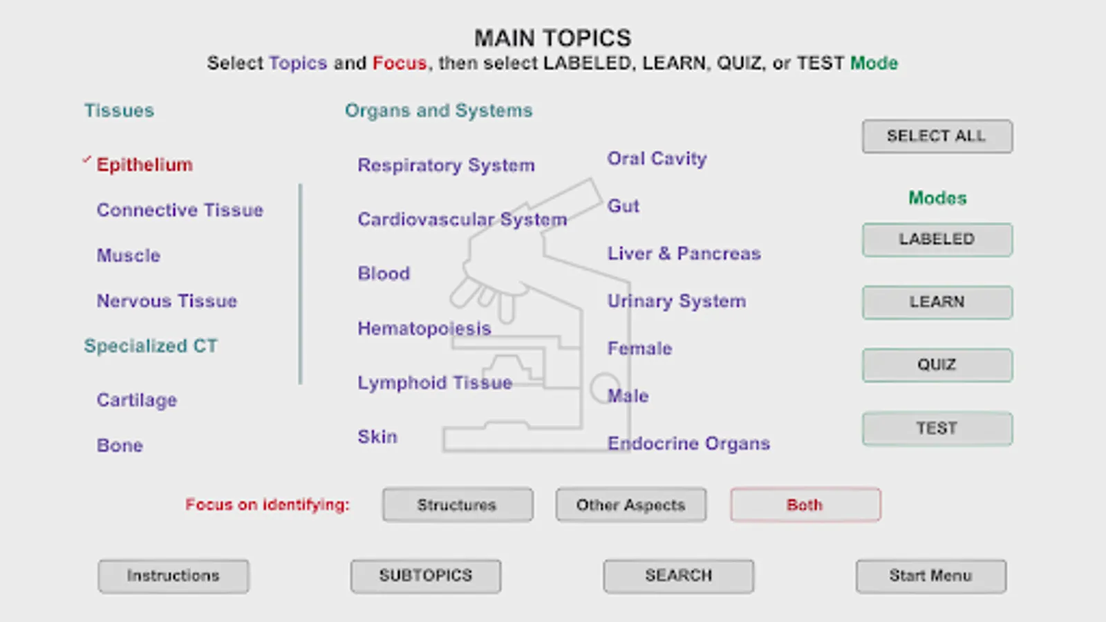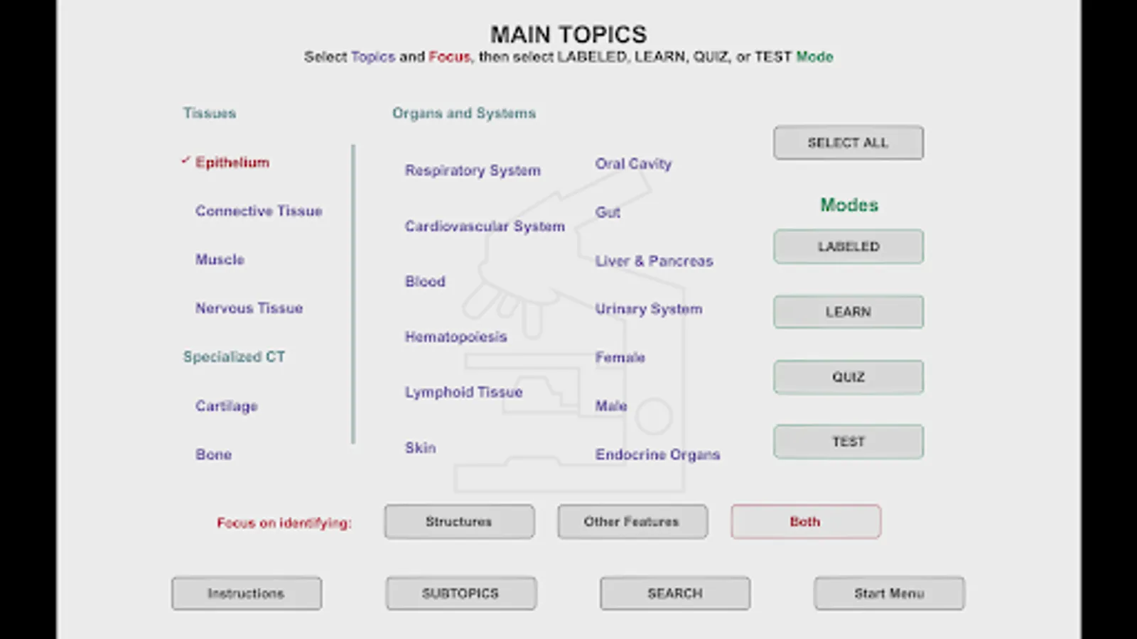 Histo! presents material in four modes. Two of the modes help those new to a topic learn to identify microanatomical structures and associated functions. Immediate self-testing is available in these learning modes, a feature students requested. Testing is the focus of the other two modes.