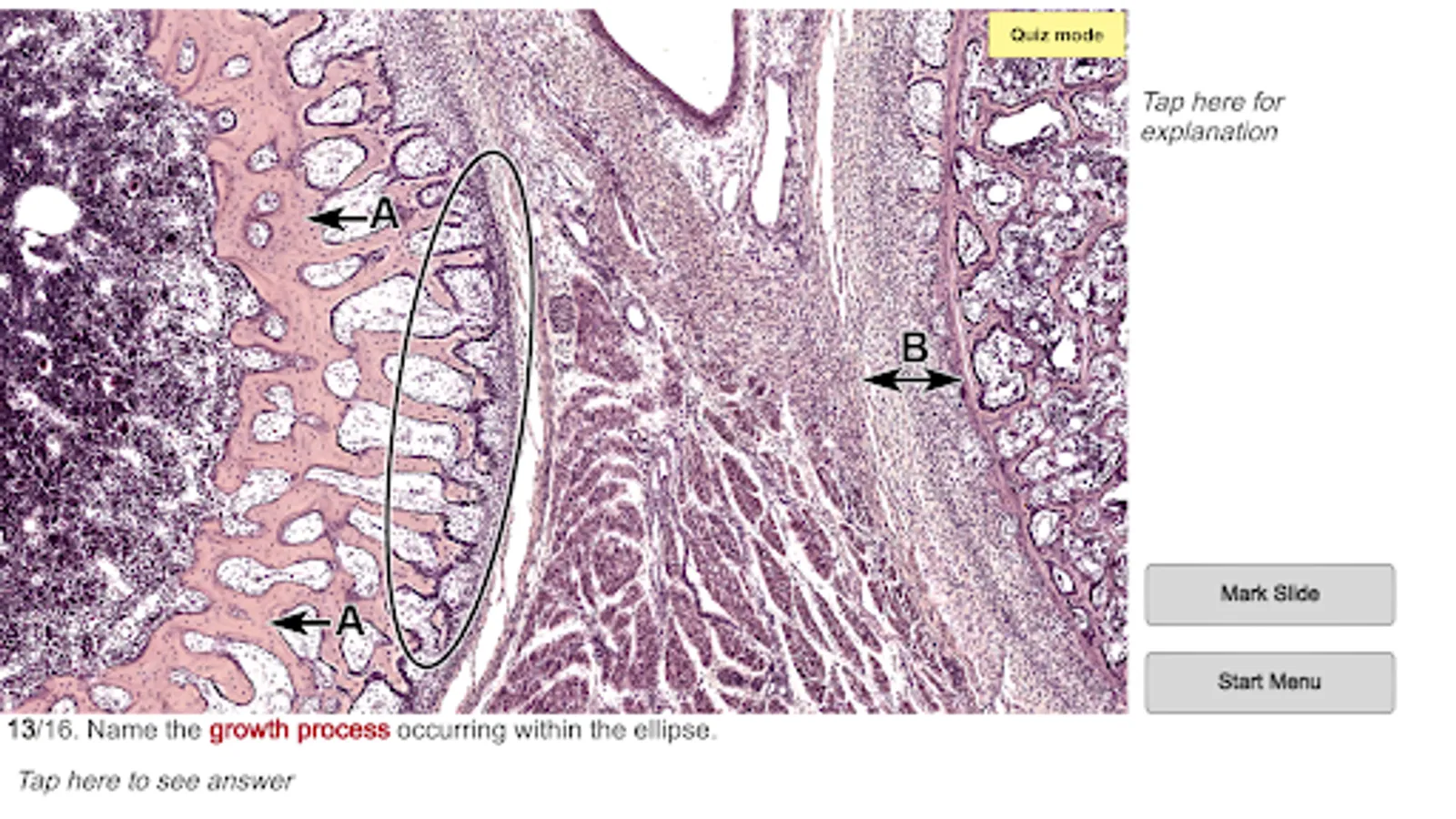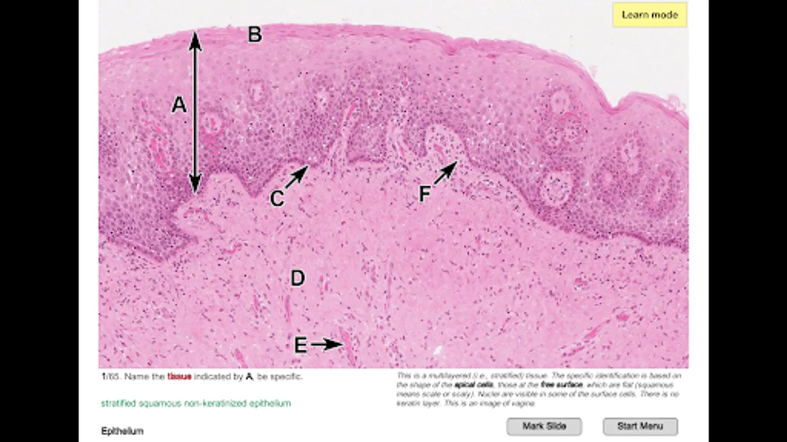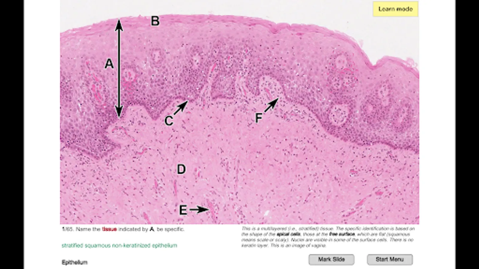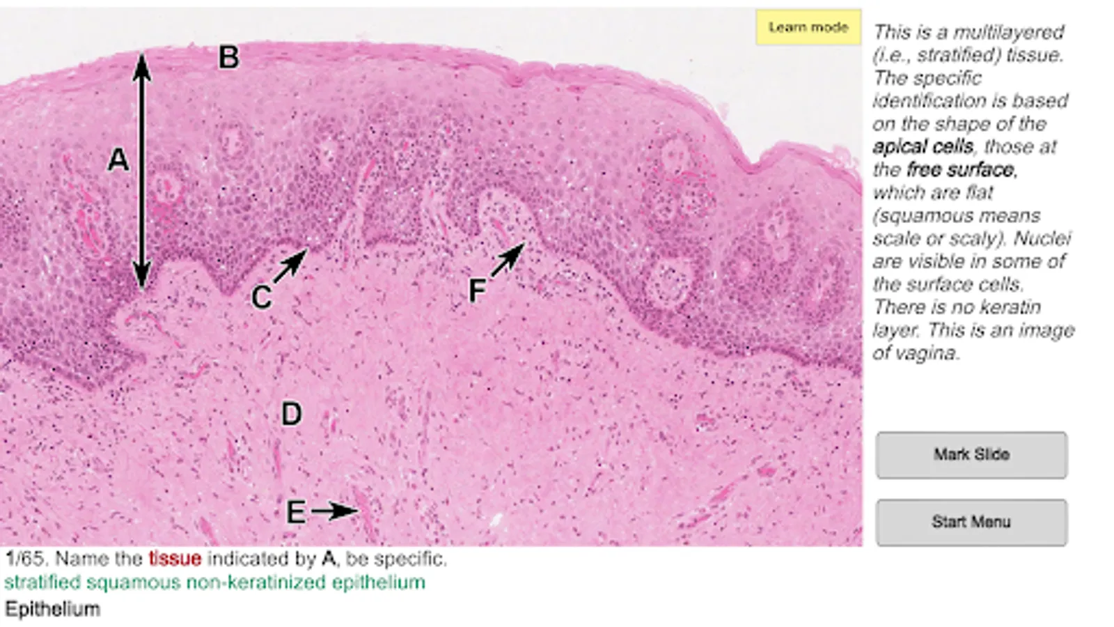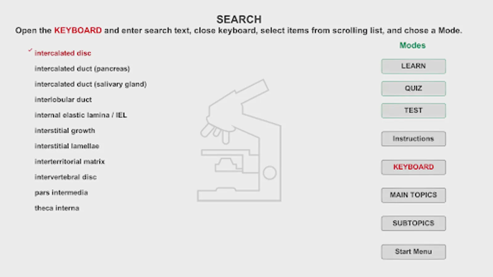 Histo! presents material in four modes. Two of the modes help those new to a topic learn to identify microanatomical structures and associated functions. Immediate self-testing is available in these learning modes, a feature students requested. Testing is the focus of the other two modes.