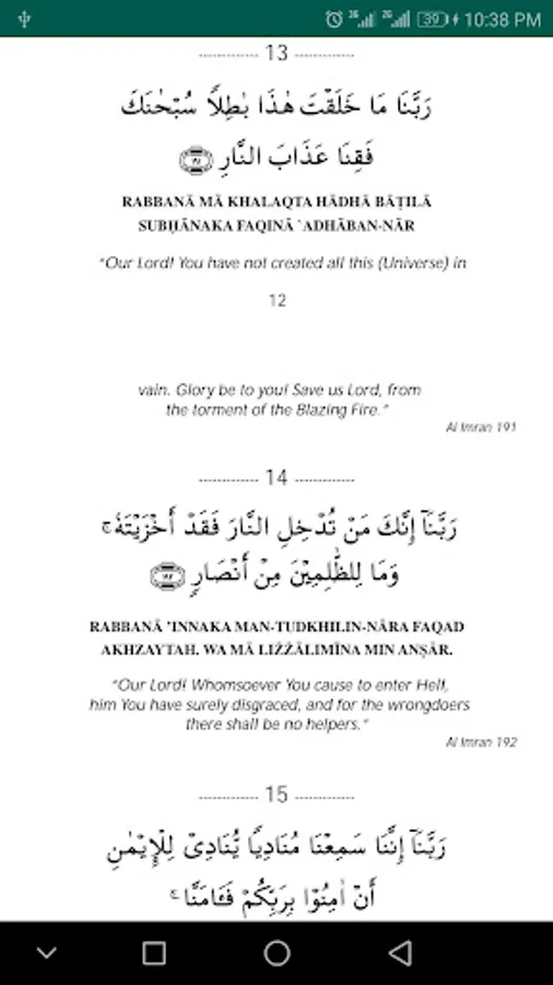 Each rabbana is displayed in Arabic with its translation.