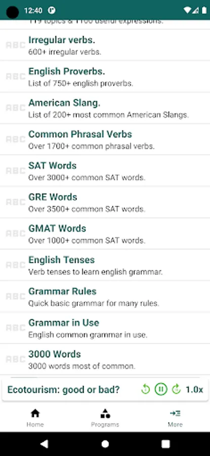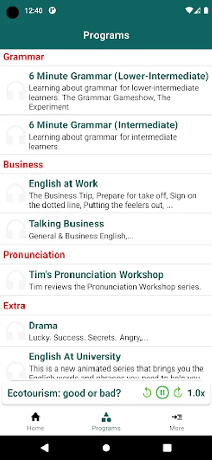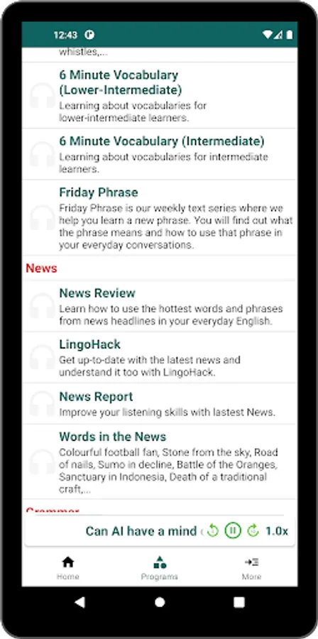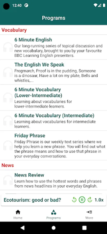 English Listening & Speaking is free application learning English and improve your English skills from BBC Learning English. With many programs: 6 Minute English, 6 Minute Vocabulary, 6 Minute Grammar, English At Work, The English We Speak, News Review with thousand lessons from BBC Learning English. Each lesson comes with audio, transcript and vocabulary, which help you to improve your English Grammar, English Speaking and expand your English Vocabulary.