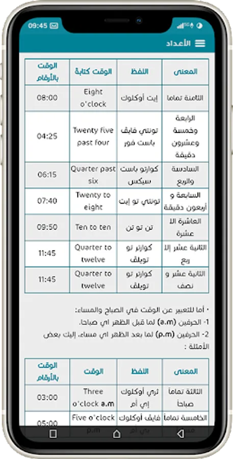 Numbers: Reading numbers, numerical and ordinal numbers, parts, plural numbers, and units of time.