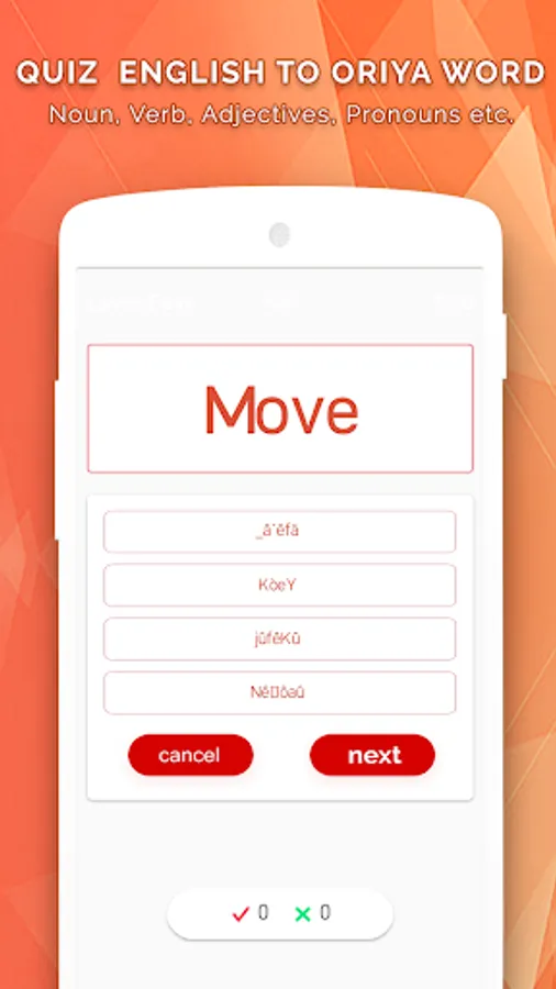 This app can help in learning both Oriya and English language. Words are provided with proper grammar usage like Noun, Verb, Adjectives, Pronouns etc.