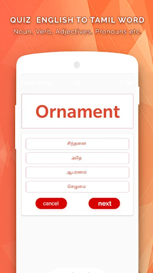 This app can help in learning both Tamil and English language. Words are provided with proper grammar usage like Noun, Verb, Adjectives, Pronouns etc.