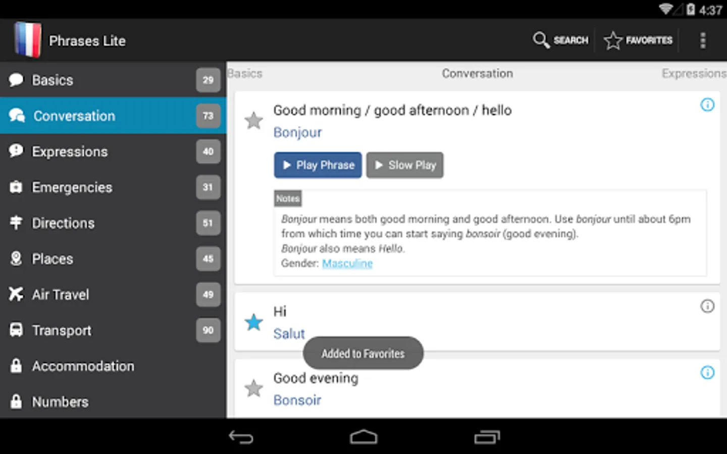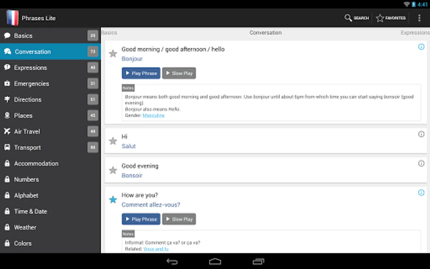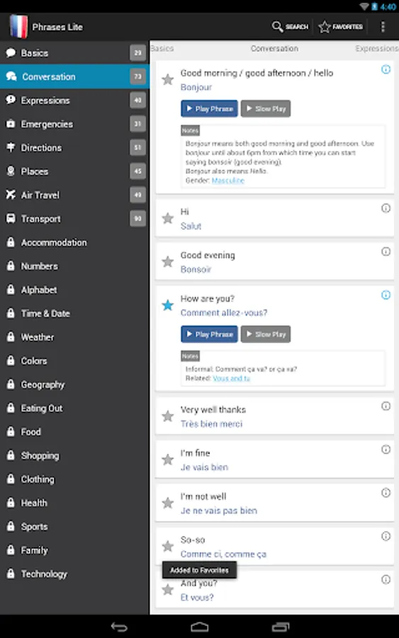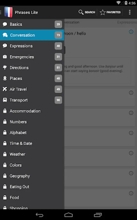 Lite includes the following categories: Basics, General Conversation, Expressions, Emergencies, Directions, Places, Air Travel and Ground Transport.