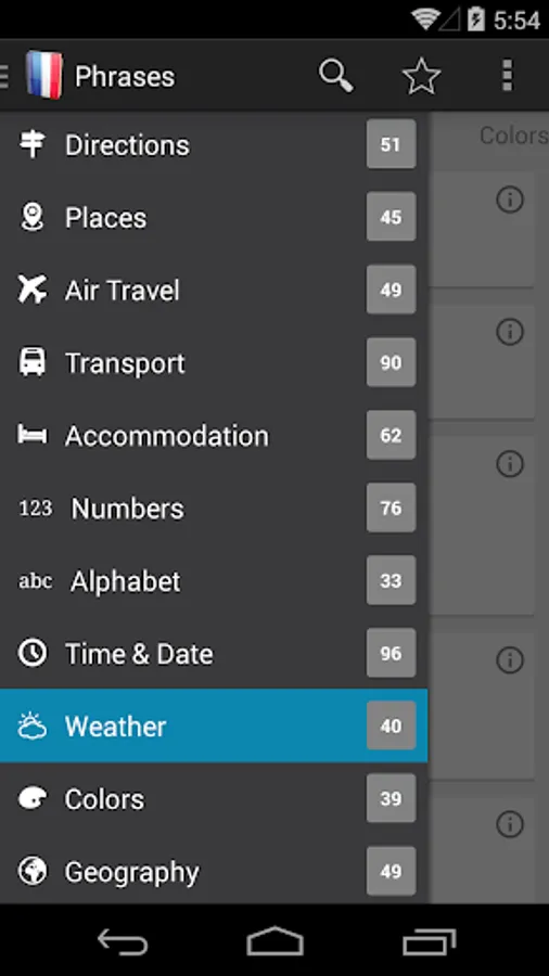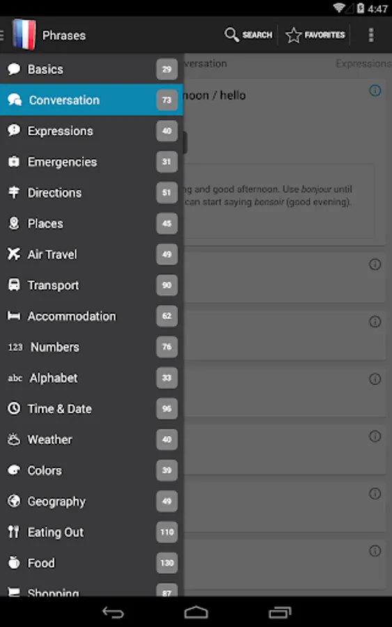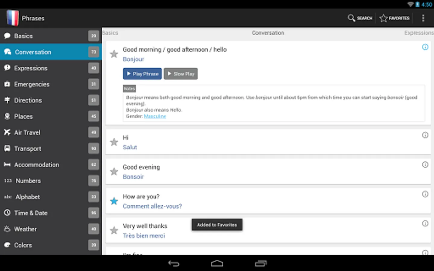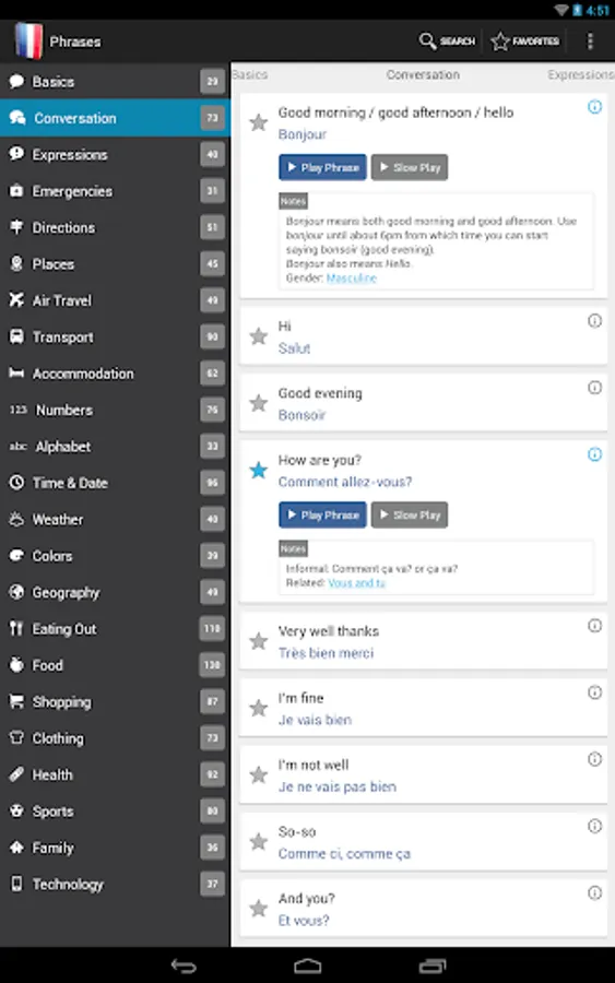 French Phrasebook Pro includes over 1400 phrases organised in the following categories: Basics, General Conversation, Expressions, Emergencies, Directions, Places, Air Travel, Ground Transport, Accommodation, Numbers, Alphabet, Time & Date, Weather, Colors, Geography, Eating Out, Food, Shopping, Clothing & Accessories, Health, Sports, Family and Technology.