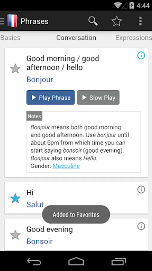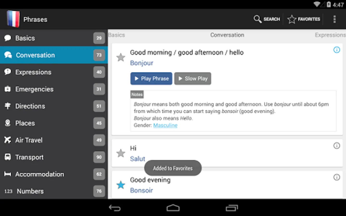 - Favorites icon to quickly add and access selected phrases
