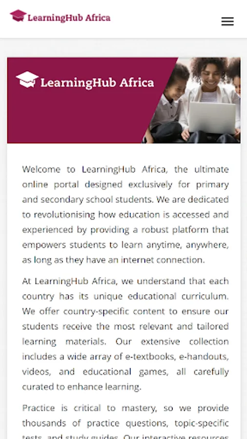 Welcome to LearningHub Africa, the ultimate online portal designed exclusively for primary and secondary school students. We are dedicated to revolutionising how education is accessed and experienced by providing a robust platform that empowers students to learn anytime, anywhere, as long as they have an internet connection.