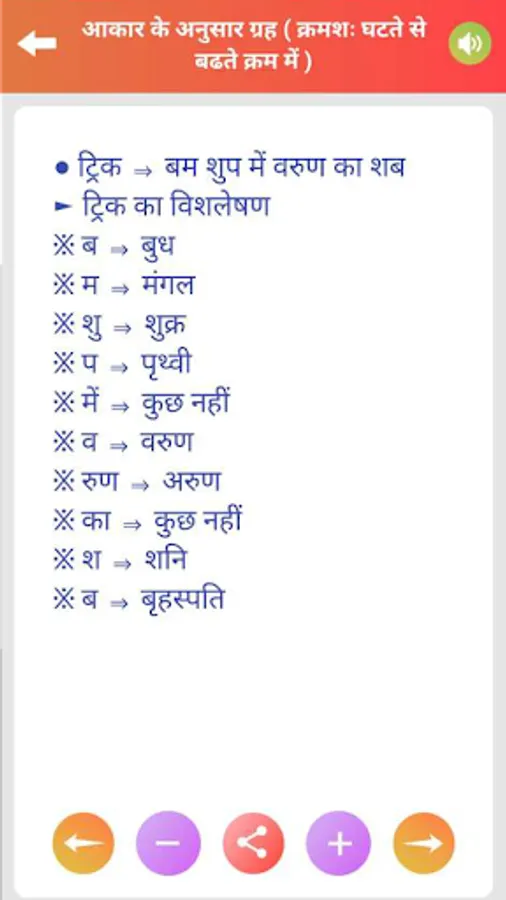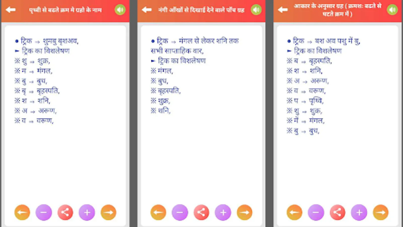 Acronyms and Abbreviations (क्रतिम शब्द): Create acronyms or abbreviations using the first letters of the words you want to remember. For example, to remember the names of the planets in the solar system (मंगलग्रह, बुधग्रह, बृहस्पतिग्रह, शनिग्रह, अरुण्डतीग्रह, पृथ्वी, वृहद्ग्रह, यमग्रह, शुक्रग्रह), you can create the acronym "म ब ब श अ प व य श."