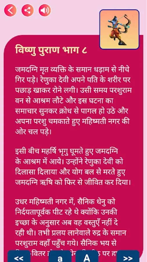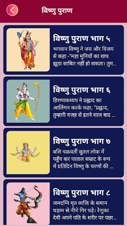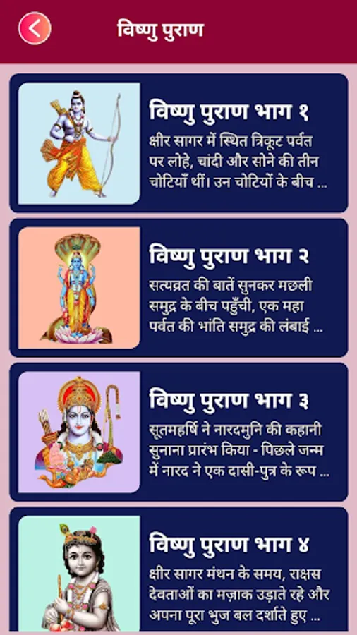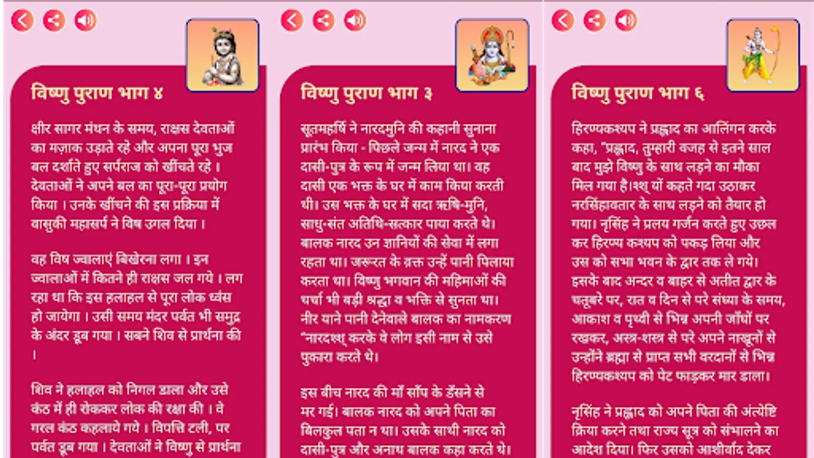 Shakti Nandan Parashar has narrated six parts to Maitreya in the first part of this, in the first part the text of this Purana has been given. Aadi Karan Sarg Devta Adi ji Origin Story of churning of ocean Daksha Adi's lineage Description of Dhruva and Prithu's character Prachetas's story Prahlad's story and the description of separate kingship given by Brahmaji to the chiefs of the deities Tiryak humans etc. All subjects have been called the first part.