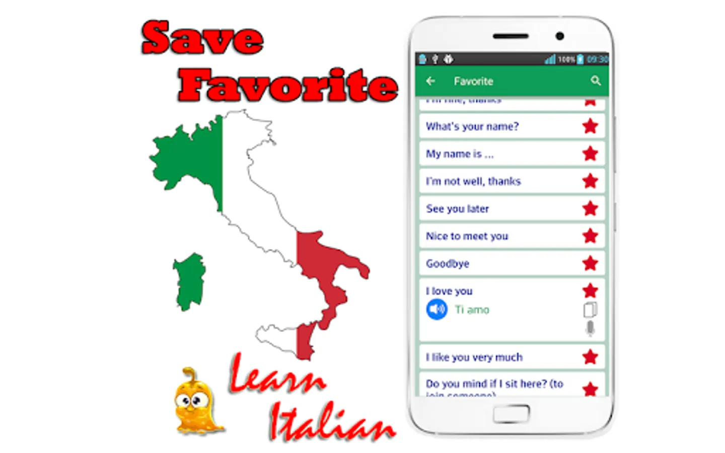 Learn Italian Language Free has 985 common phrase in italian language free with sound and you can use all of them without network. Very useful for you learn and go to tralvel to the world. Learn italian grammar is very easy!