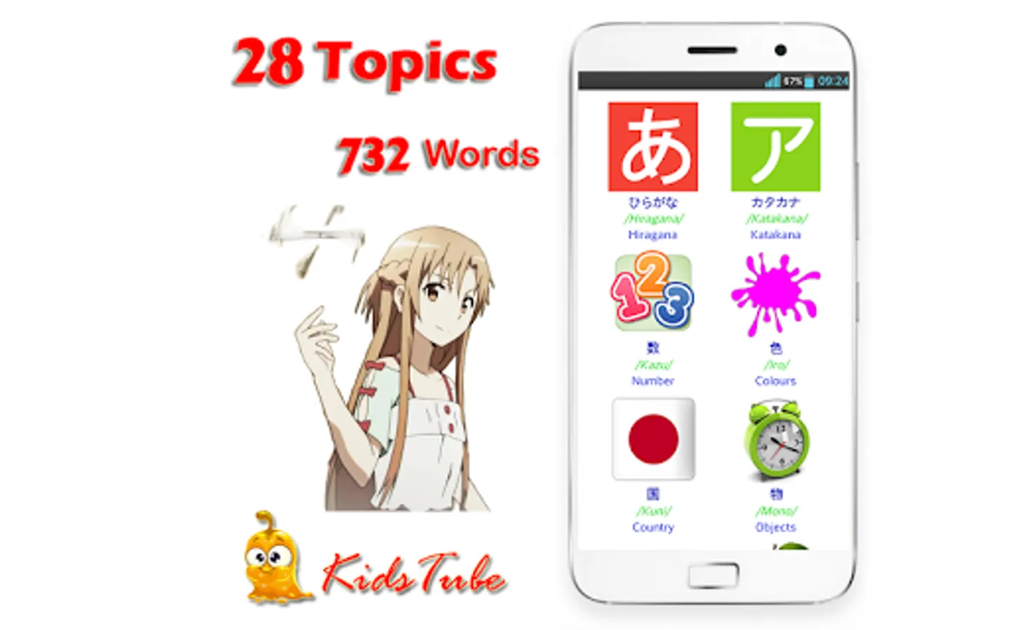 Learn Japanese Vocabulary for Kids has 29 topics which are around you real life, 792 words vocaburaly with sound and images of them . You can use all of them without network, it’s free.