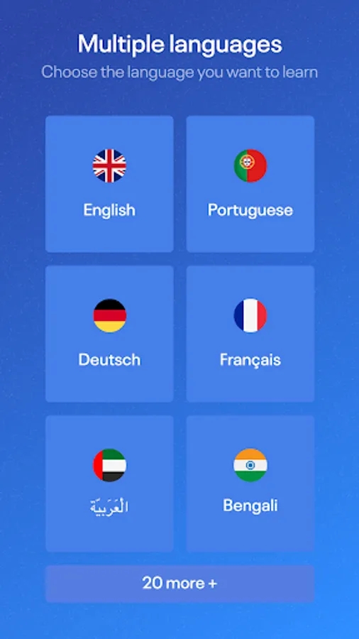 Learn 30+ Languages: Learn Arabic, Azerbaijani, Belarusian, Deutsch (German), Ελληνικά (Greek), English, Español (Spanish), Farsi, French, Gujarati, हिंदी (Hindi), Bahasa Indonesia (Indonesian), Italian, Hebrew, Japanese, მალი (Georgian), khmer kandal, Korean, Mongolian, Marathi, Melayu, Dutch, Punjabi, Polish, Portuguese, Română (Romanian), Russian, Serbian, Swahili, தமிழ் (Tamil), Thai, Türkçe (Turkish), Urdu, Uzbek, Tiếng Việt (Vietnamese), 中国人 (Chinese). We've got you covered with an extensive list of languages to learn! Learning languages easily is our job! Now aprender Ingles with the aplicacion para aprender ingles!
