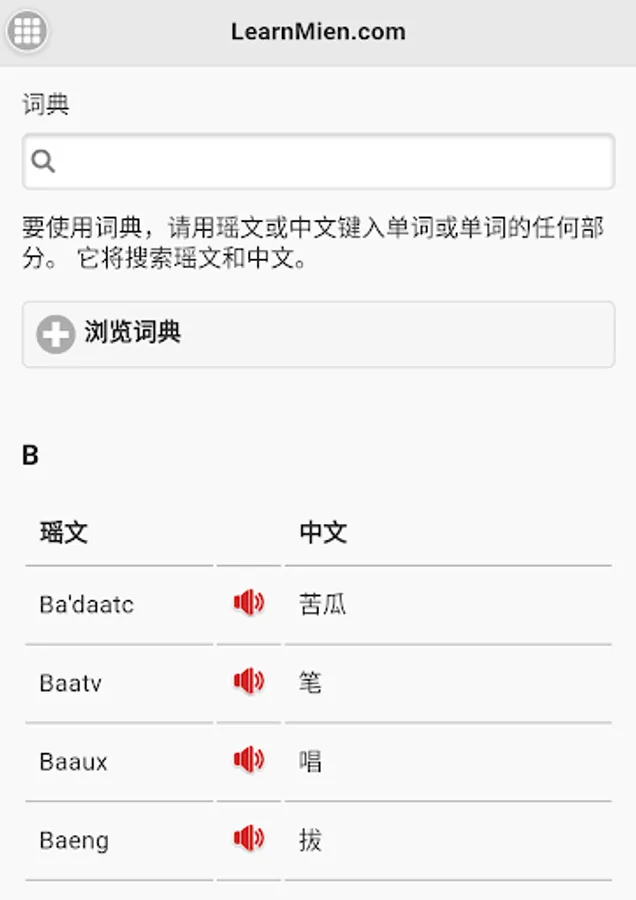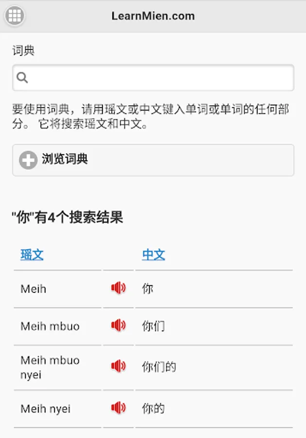 Mien to Chinese and Chinese to Mien Dictionary with pronunciation online and free. New words are constantly being added to the dictionary. Since the app requires an internet connection, it is connected to our online database which contains the latest vocabularies. From the search bar, type in any Mien or Chinese word or part of a word and it will search through the dictionary.