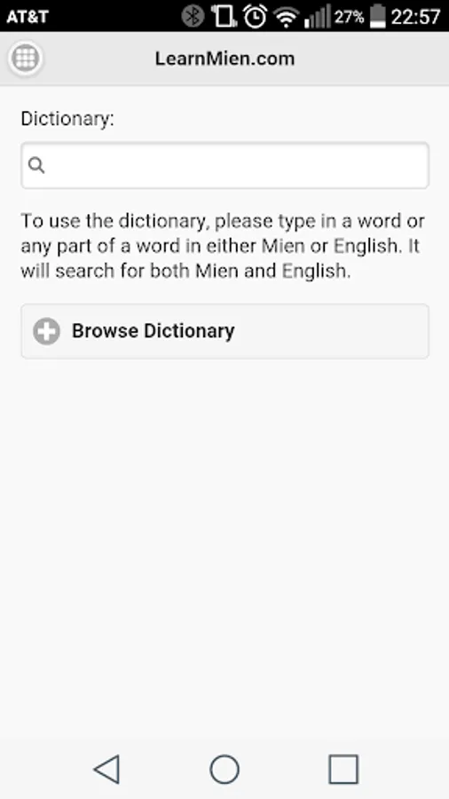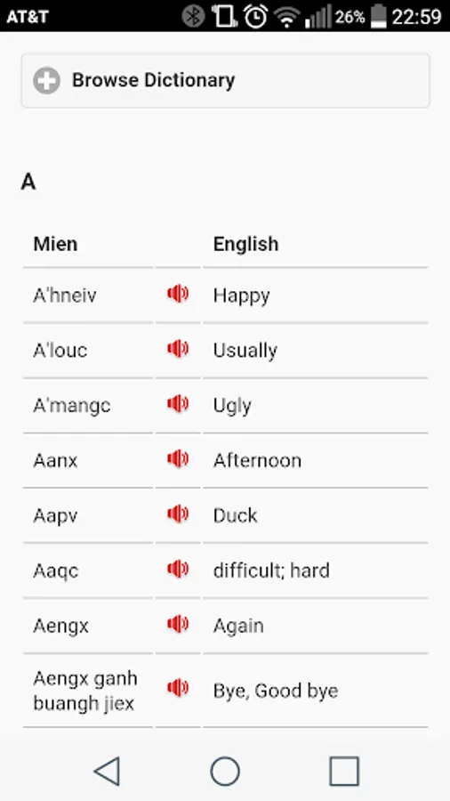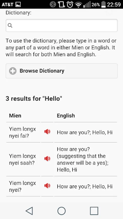 Mien to English and English to Mien Dictionary with pronunciation online and free. New words are constantly being added to the dictionary. Since the app requires an internet connection, it is connected to our online database which contains the latest vocabularies. From the search bar, type in any Mien or English word or part of a word and it will search through the dictionary.