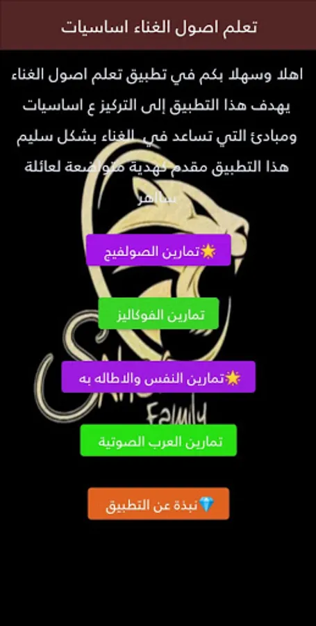 The application aims to learn singing and its origins in a simple and correct academic way and increase singing skills through interactive content that highlights the possibility of sound and give more space to singing where the individual can, with daily training, move through the layers and saturate the sound with melody. The exercises that were developed in this application aim to increase the area of sound and refine the voice It is dissonant, I hope that the application is as good as you think. This application has been explained in it the basics of oriental singing in a brief and smooth manner
