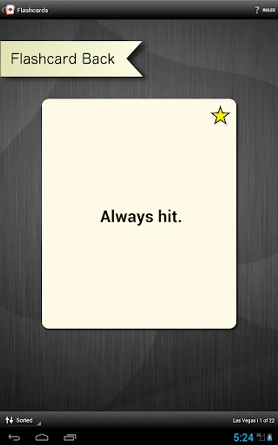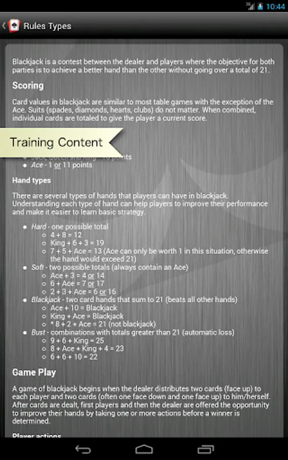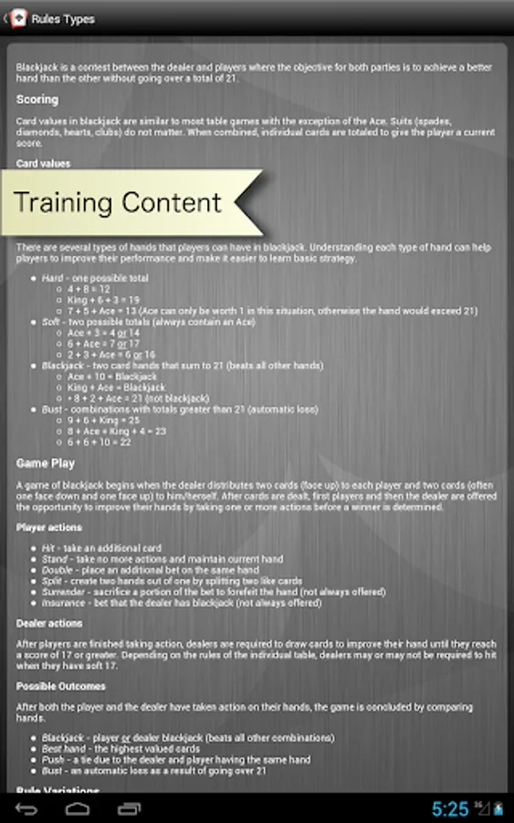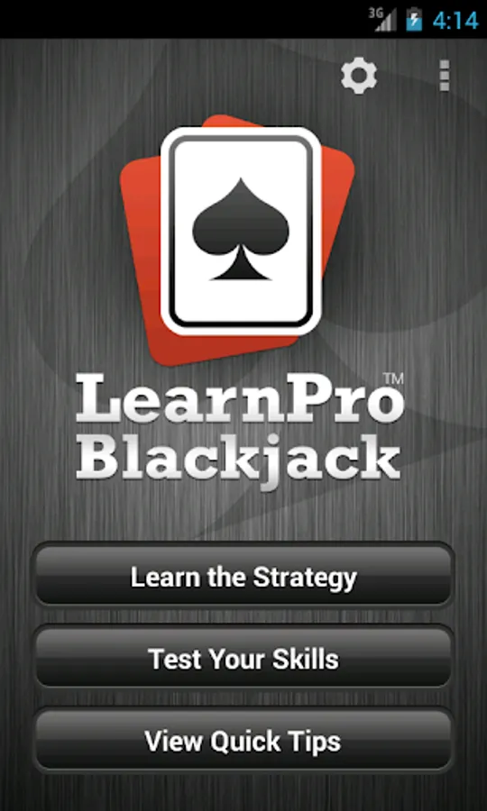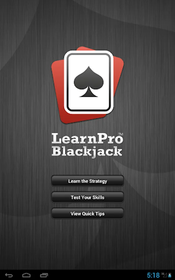 Learn Pro Blackjack trainer app for Android phones and tablets helps you quickly and easily learn basic strategy to boost your confidence, have more fun, and win more often. The app has all of the features you would expect from a premium training application including retina display graphics, game rules, basic strategy flashcards, a blackjack training game, and quick tips. Take a look: