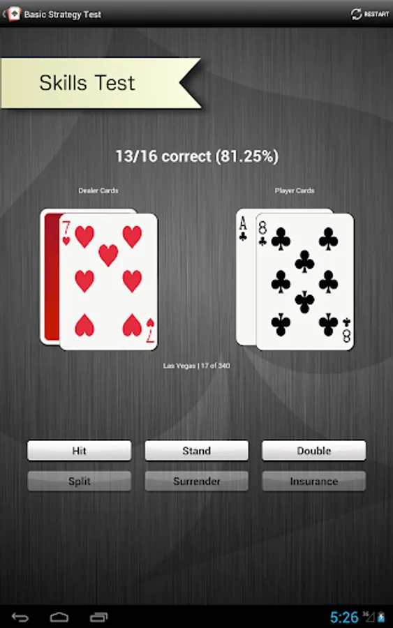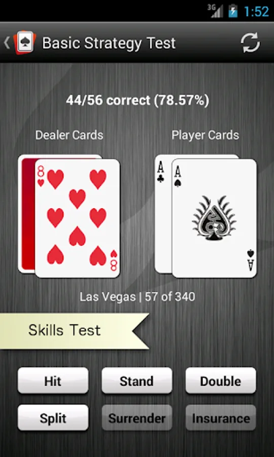 * Play the entertaining “Test Game” to perfect your skills in a simulated blackjack environment. The game feeds you random hands, lets you determine your move, and records your performance. Play until you score 100% and have proven that you have mastered basic strategy.