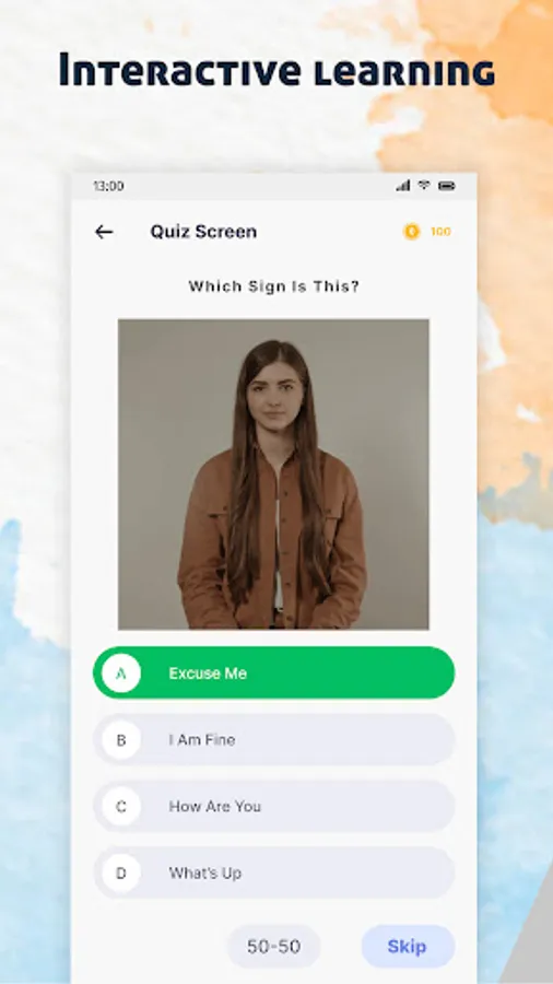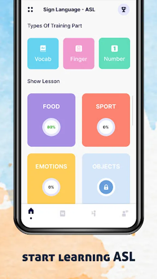 Learn the different phrases like vocabulary, finger numbers, and more categories. Study the words with the GIF video and along with the explanation of the word. You can slow the GIF speed to observe the sign and learn it. In each category, there will be a different number of lessons.
