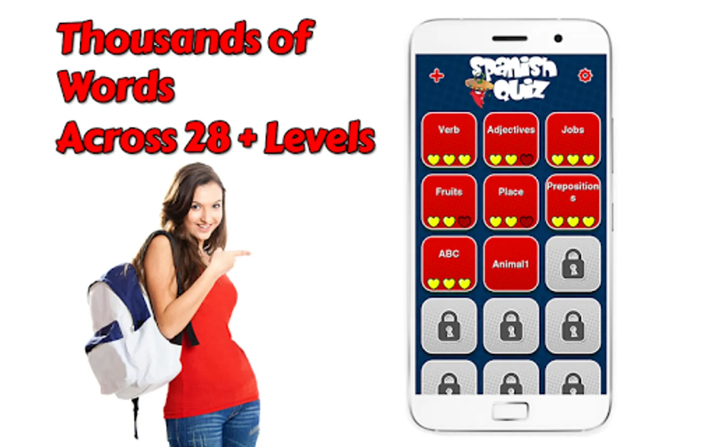 Game to learn Spanish has 28 level which are around you real life, 694 words vocaburaly with sound and images of them . You can use all of them without network, it’s free.