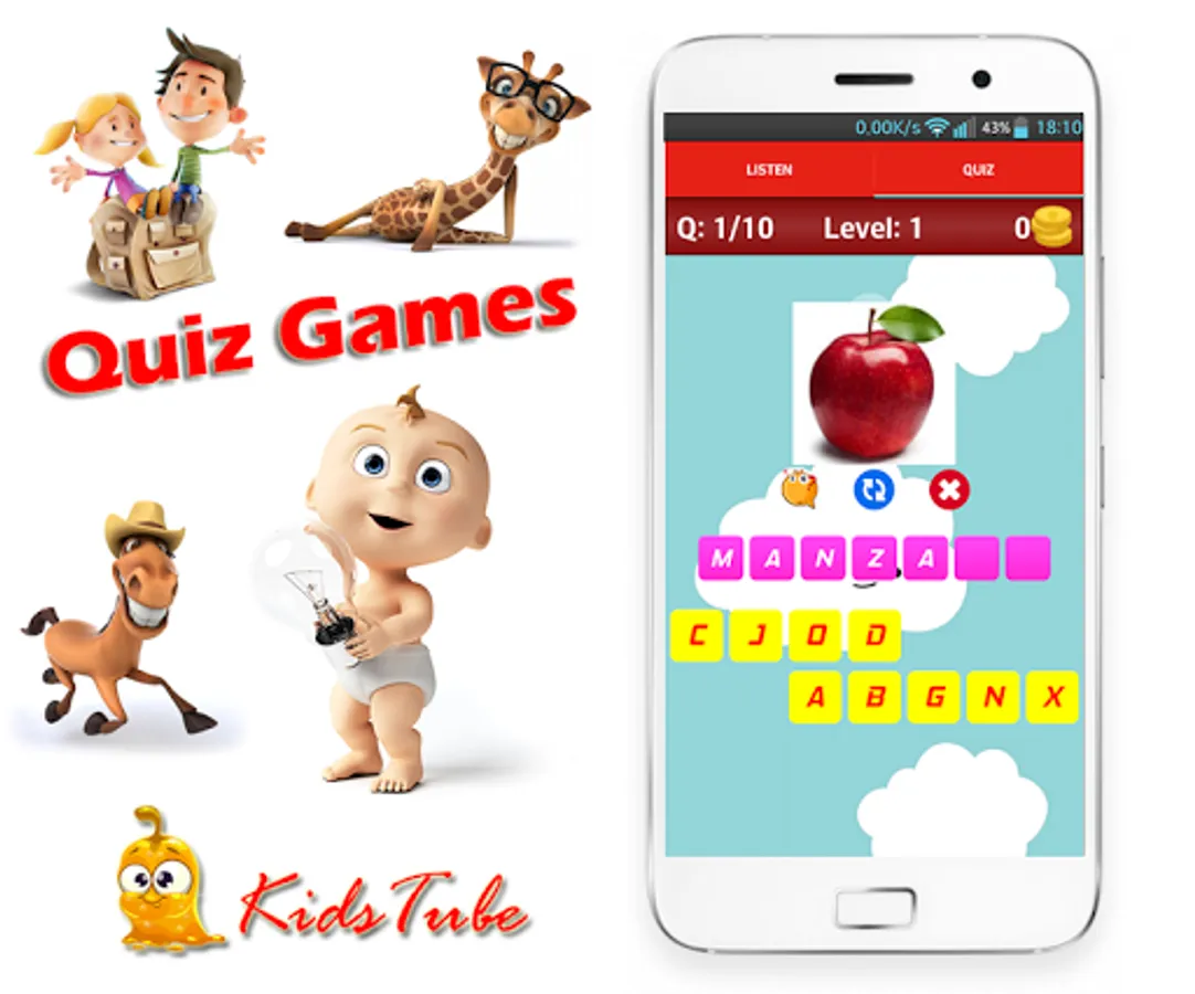 So, Learn Spanish for Kids has 2 fun game. In game, kids can practice phonics Spanish, help kids remember vocabulary better. One word will be automatically pronounced, kids have to listen what is it, then choose true image by touching screen.