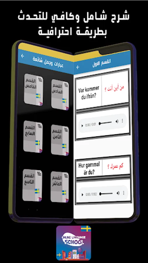 Third: Common Swedish phrases and expressions, which are more than 1000 renewed sentences divided into several levels and with varying degrees of difficulty Suitable for beginners and advanced inclusive of all topics used in public life Supported by translation and audio to facilitate study