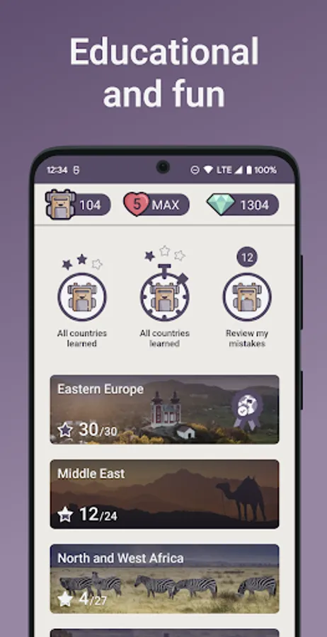 The educational content is structured by theme. You can therefore unlock regions of the world as you progress.
