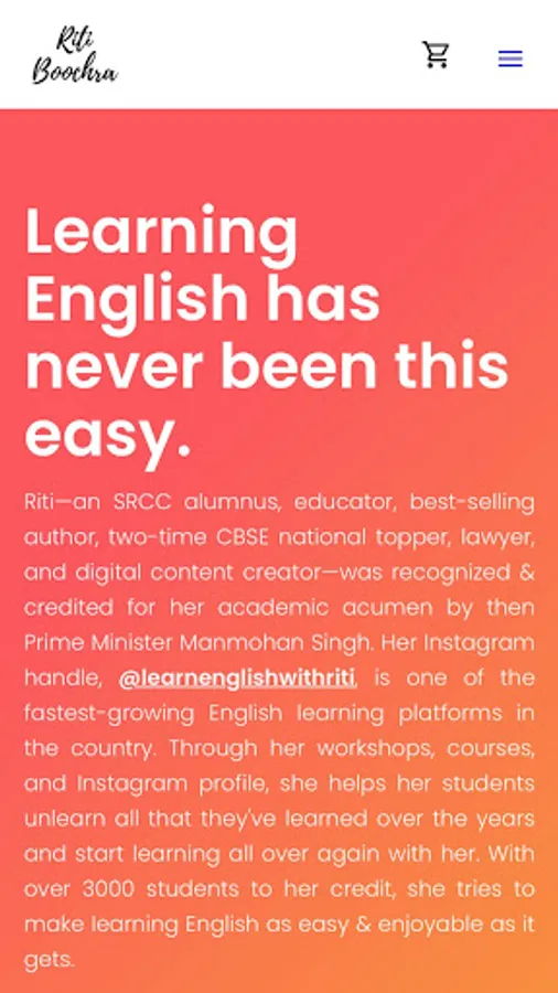 Who is Riti? Riti is an SRCC alumnus, educator, best-selling author, two-time CBSE national topper, lawyer, and digital content creator. She was recognized & credited for her academic acumen by Prime Minister Manmohan Singh. Her Instagram handle, @learnenglishwithriti, is one of the fastest-growing English learning platforms in the country. Through her Instagram profile, online workshops and courses, she helps her students unlearn all that they've learned over the years and start learning all over again with her. With over 3000 students to her credit, she tries to make learning English as