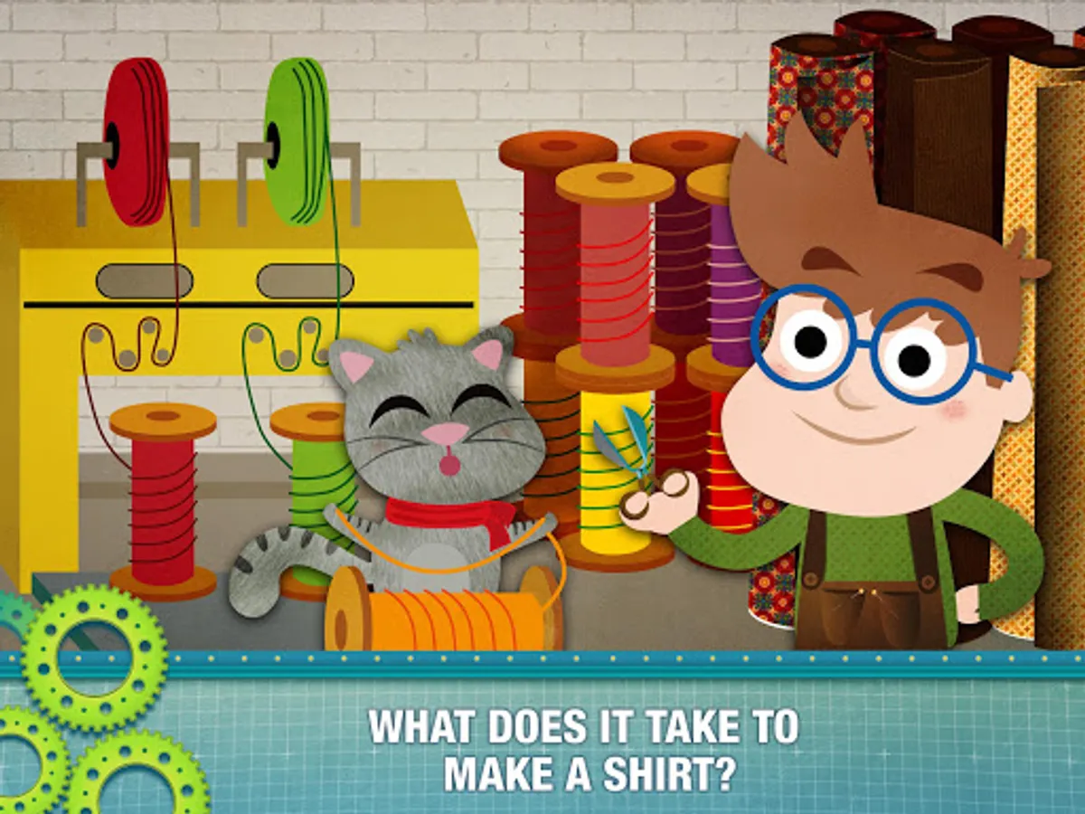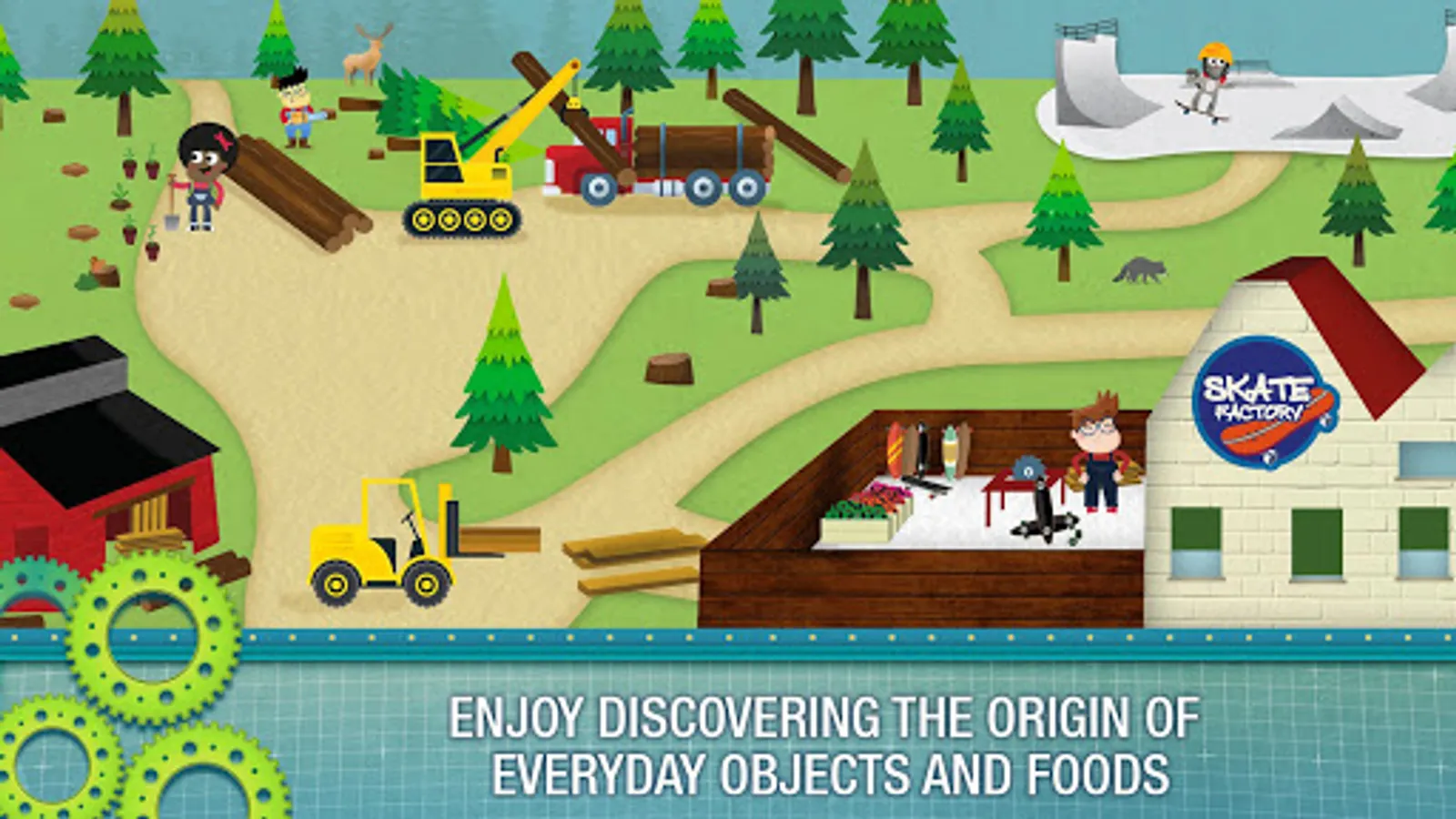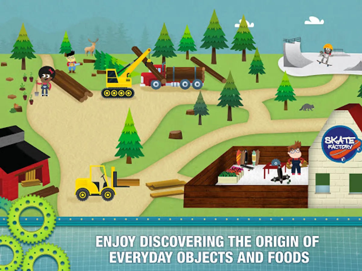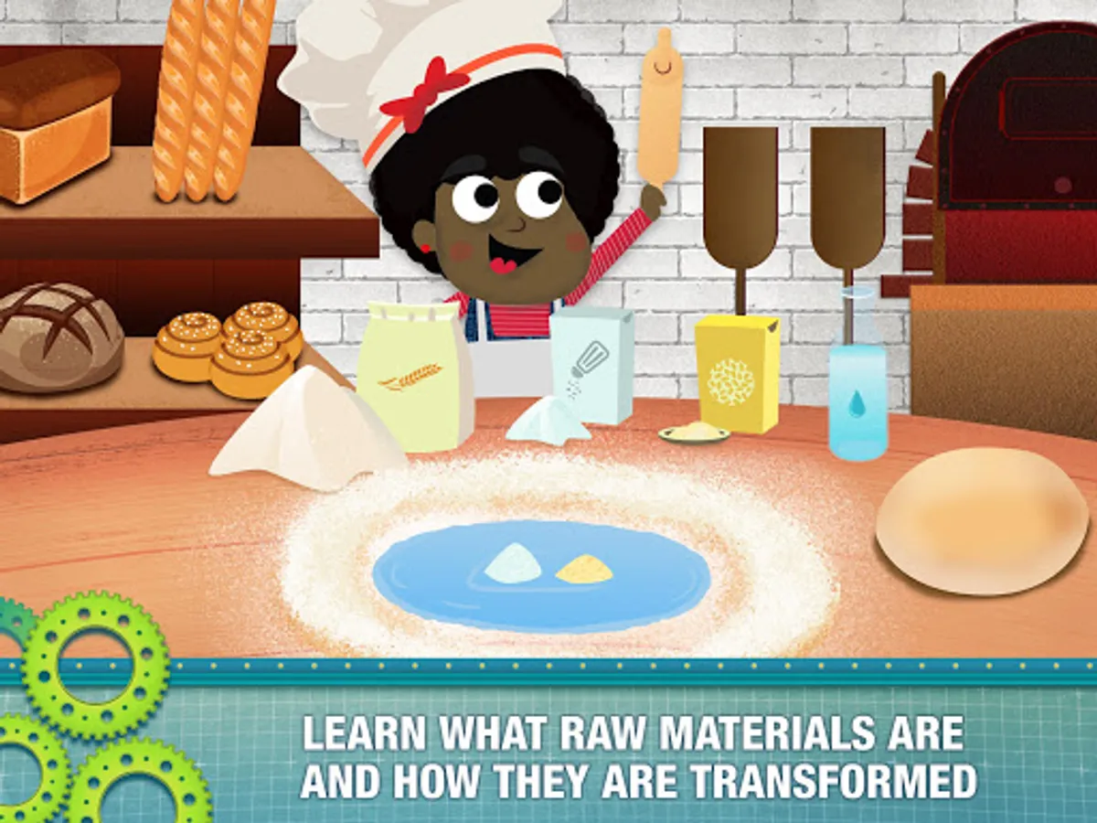 • Dozens of educational games: clean the impurities from the cotton to make thread, screw the wheels on a skateboard, mix the ingredients to make bread, grind the grains to make flour, lift the bags into the truck, pass the rollers to print the book…