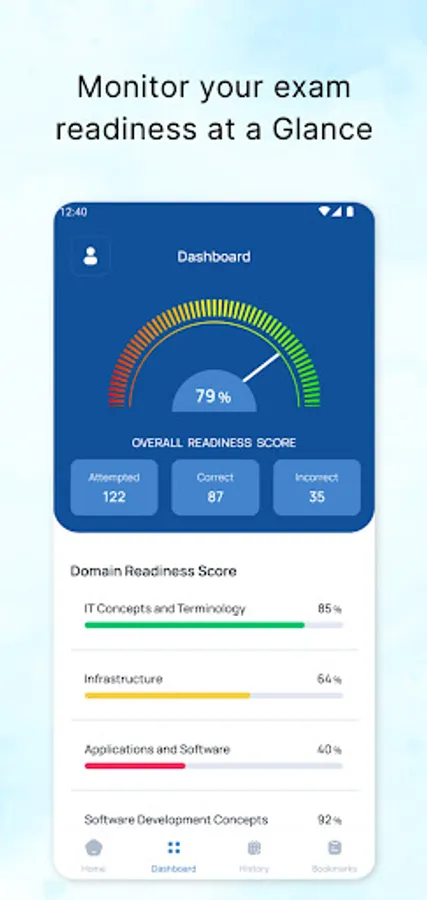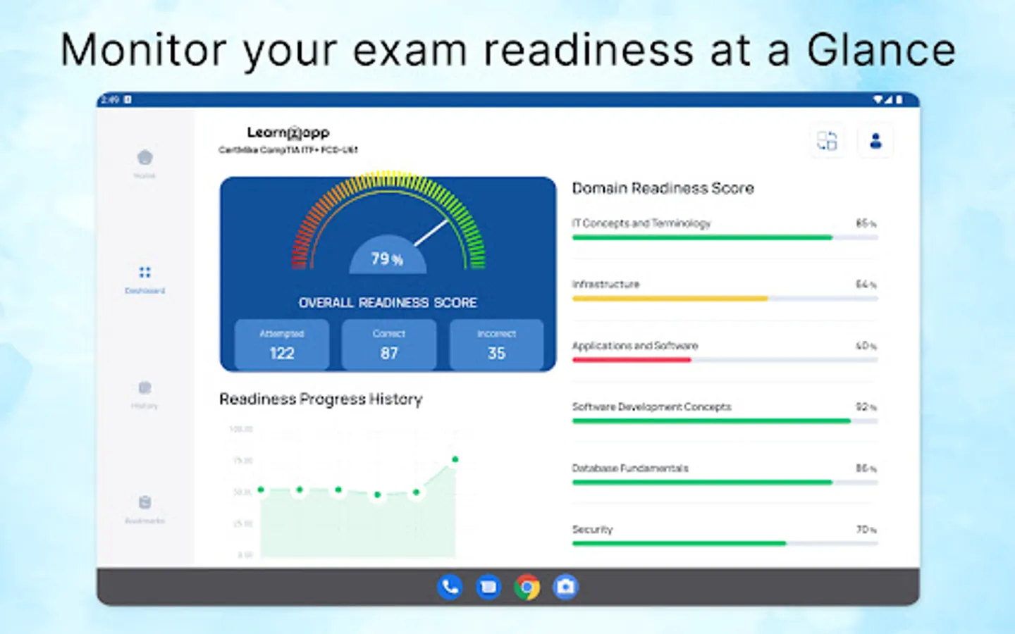 Our innovative Readiness Score feature evaluates your performance and provides a detailed report on your exam preparedness. It highlights the domains you should concentrate on, ensuring a focused and effective study plan.