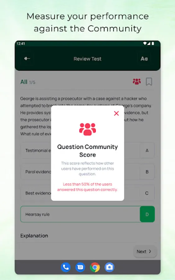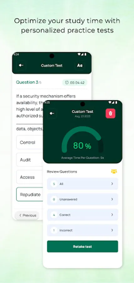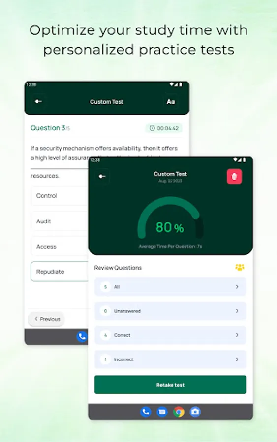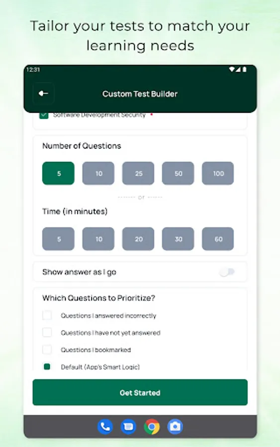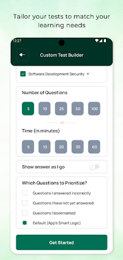 Personalize your practice with our custom test builder feature. Select specific topics and questions to create tests tailored to your needs. The test engine generates personalized tests with a mix of new and your weakest questions, helping you focus on the areas where you need the most improvement.