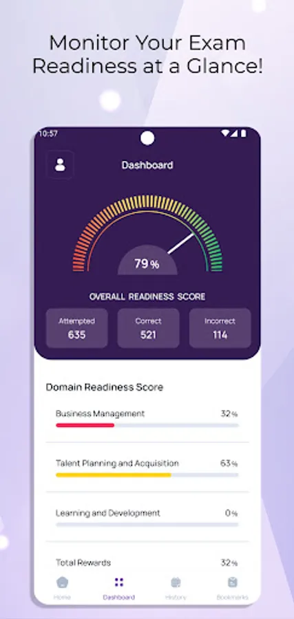 Assess your preparedness for the real exam with our innovative readiness score feature. This insightful tool guides your study focus, highlighting the areas needing more attention.