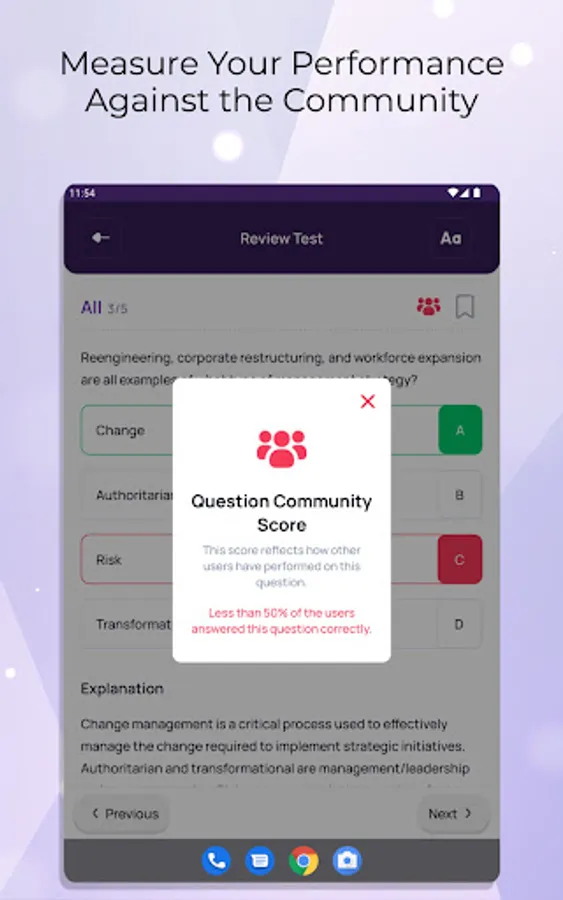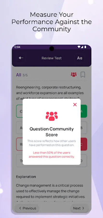 Take advantage of our unique 'Community Score' feature that provides a benchmark of your performance against others on each specific question or test. This insightful tool allows you to gauge your relative standing and competition.