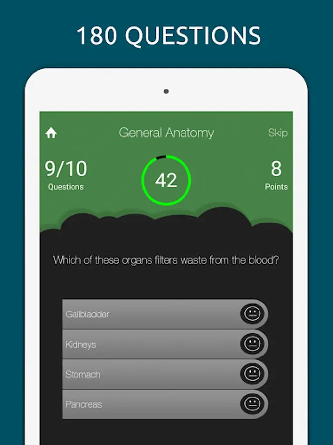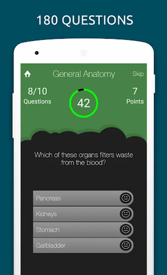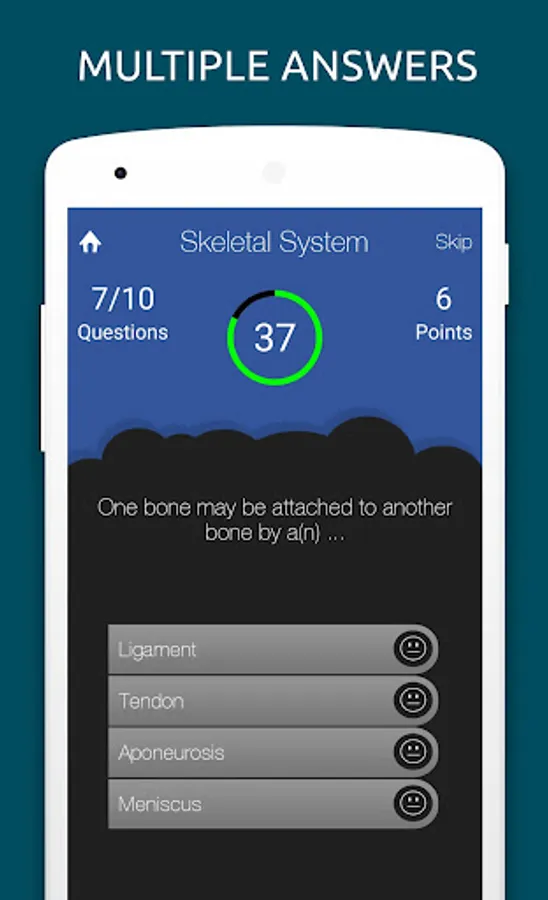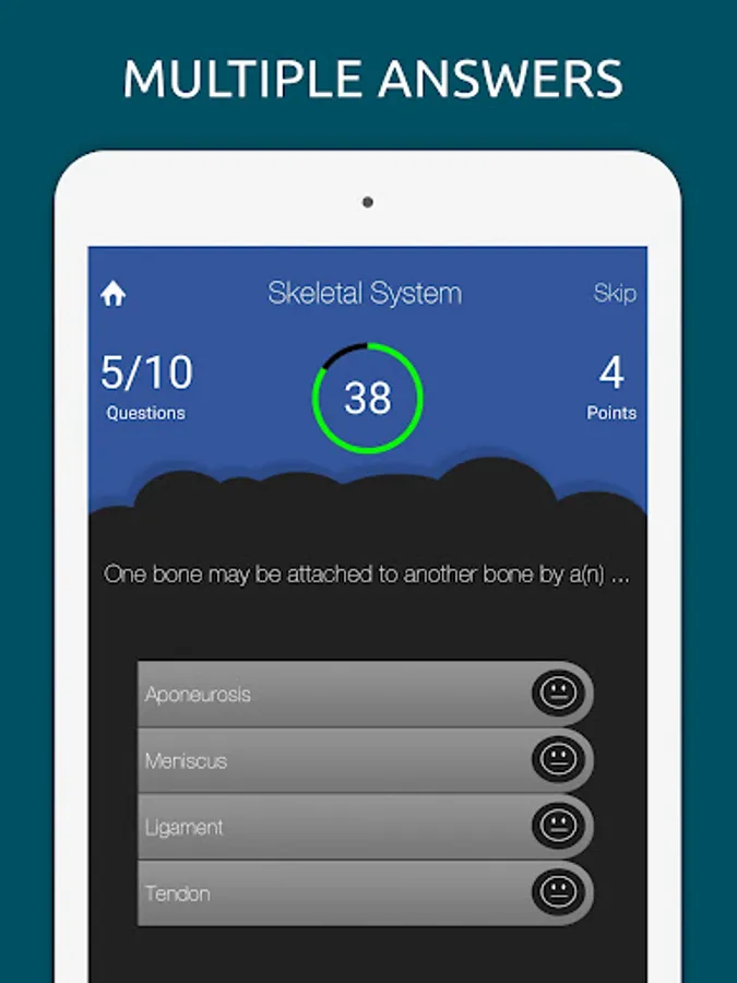 Questions and answers are shuffled randomly every time you play. You can skip a question, if you don't know the answer. Play multiplayer one on one with your friends!