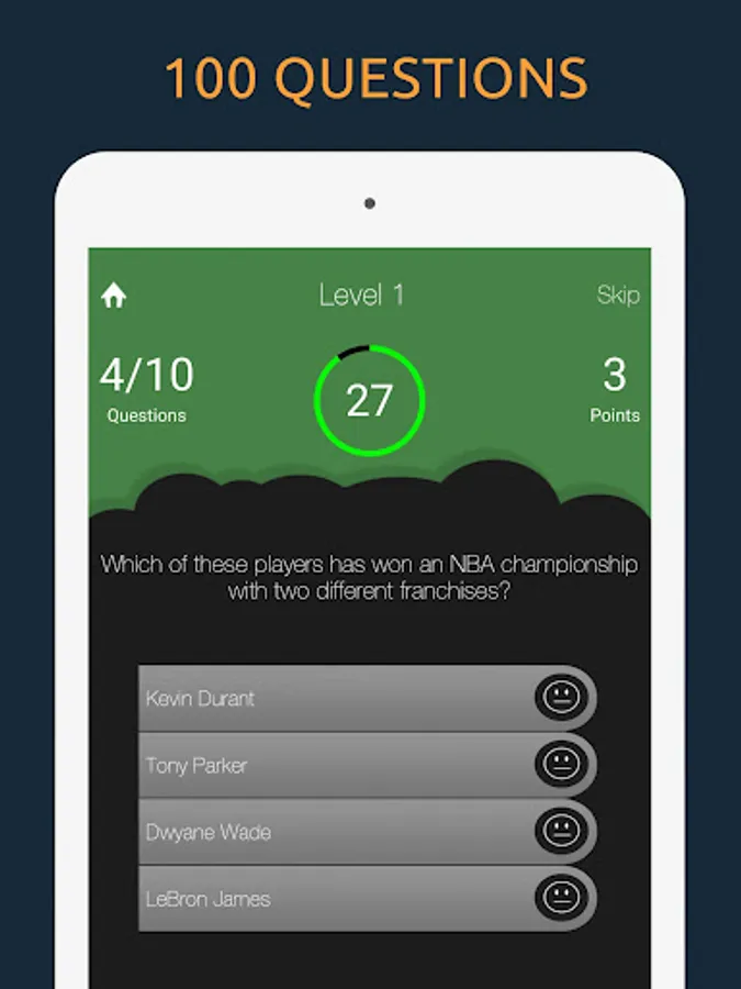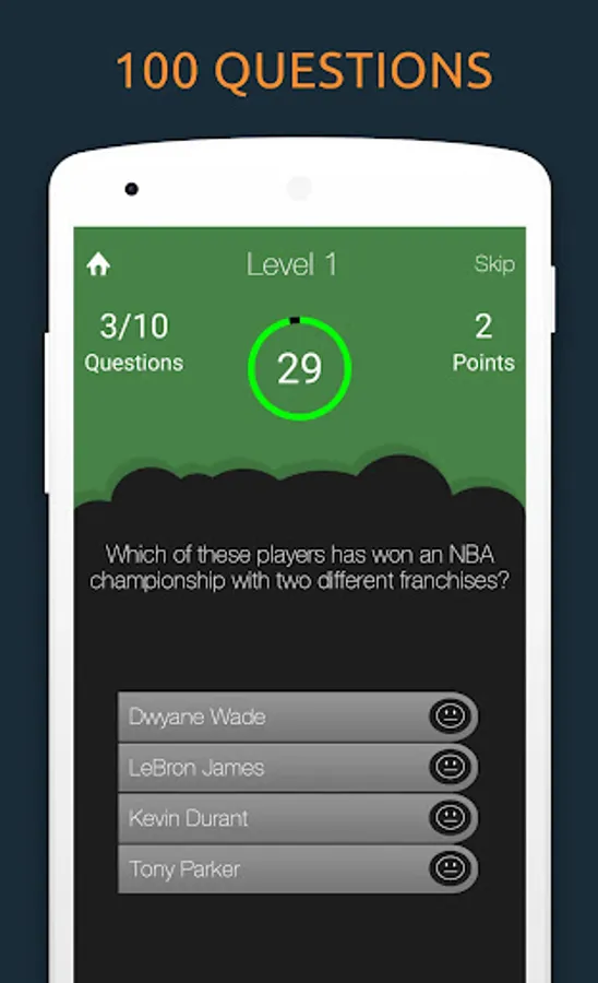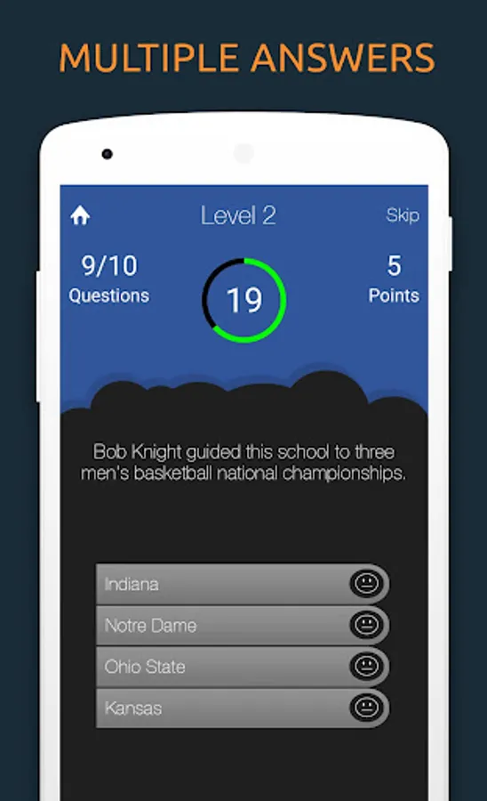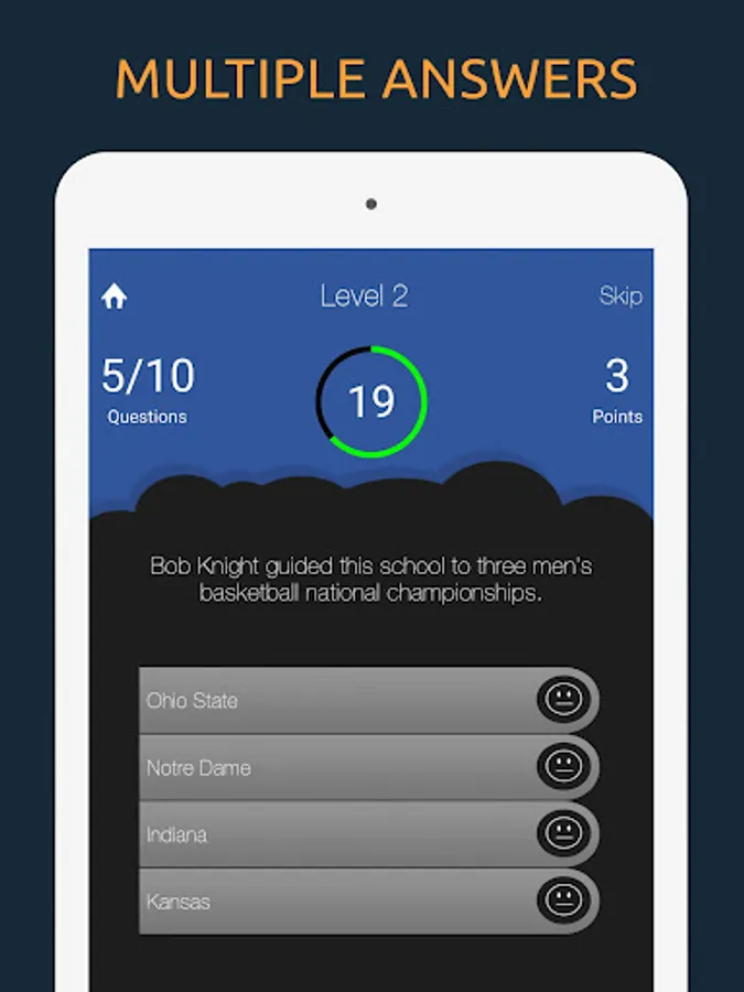 Trivia questions and answers are shuffled randomly every time you play. You can skip a question, if you don't know the answer. Play multiplayer one on one with your friends!