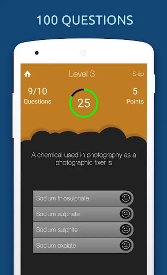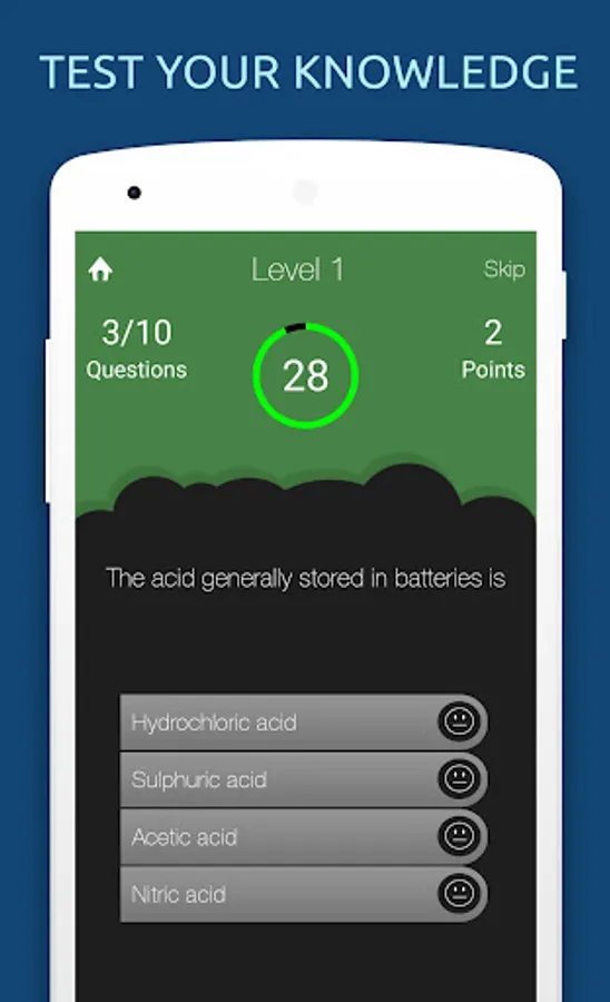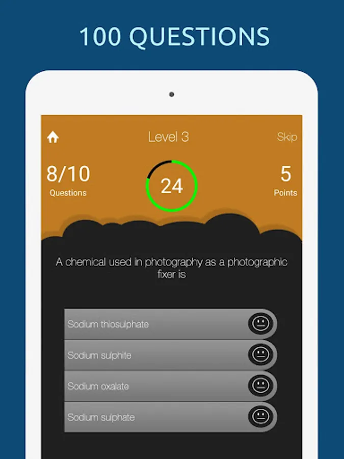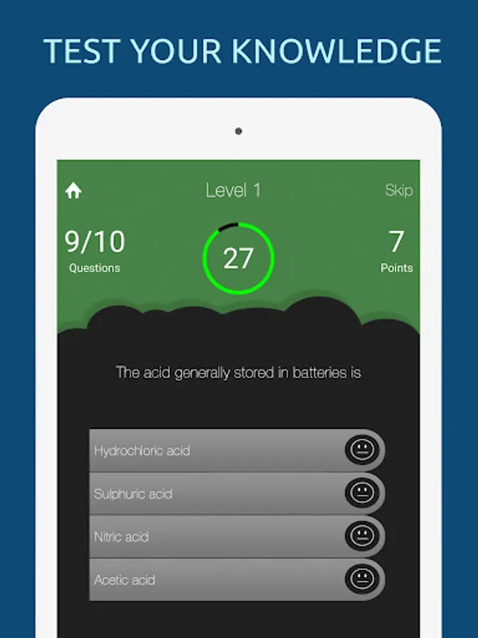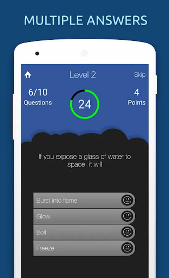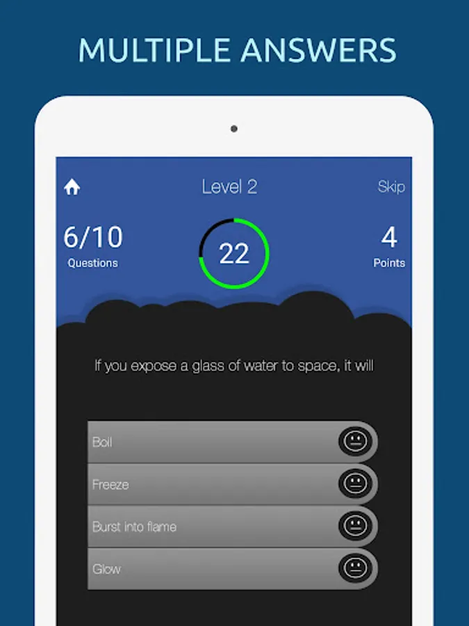 Questions and answers are shuffled randomly every time you play. You can skip a question, if you don't know the answer. Play multiplayer one on one with your friends!