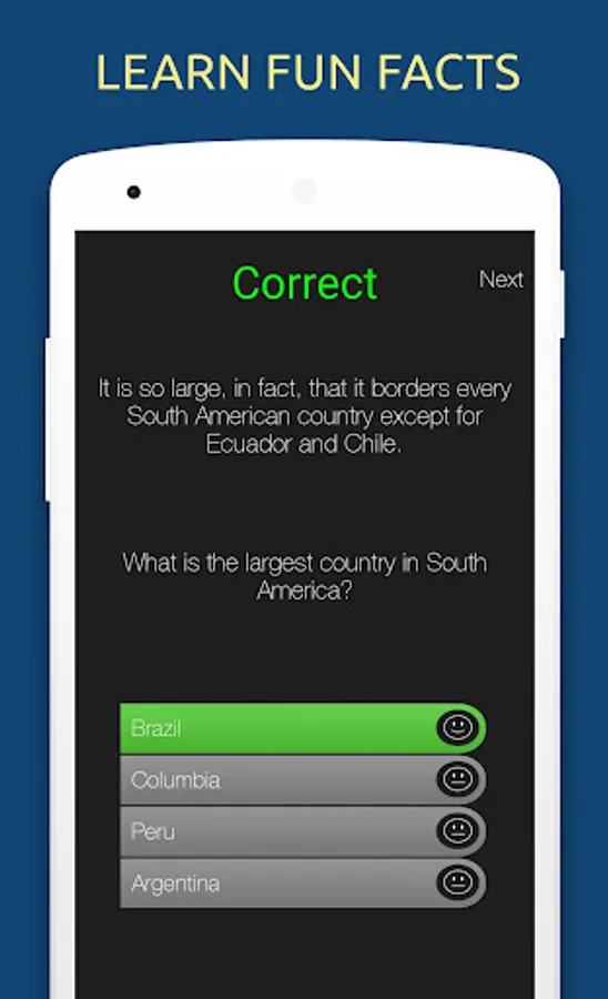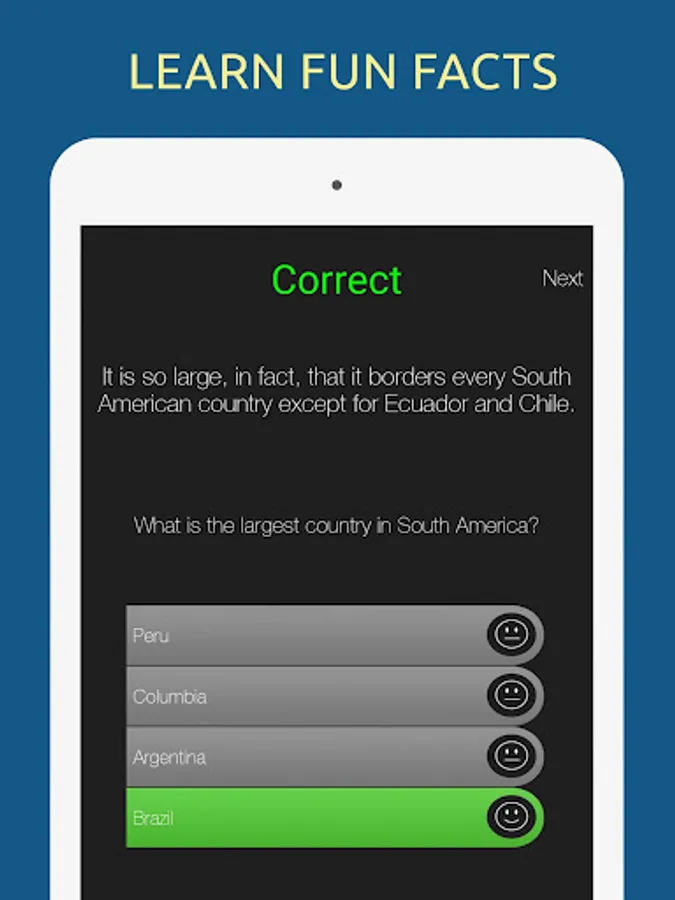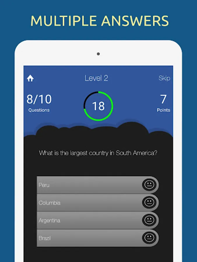 The quiz contains questions about countries, cities, flags, capitals, population, religion, language, currency, and much more! You can skip a question, if you don't know the answer. If you are correct, you can read a geographical fact!