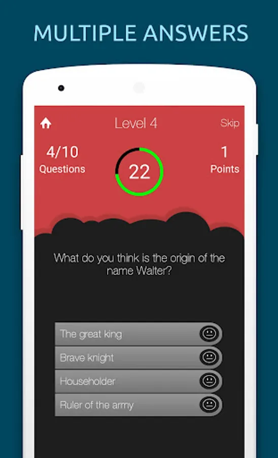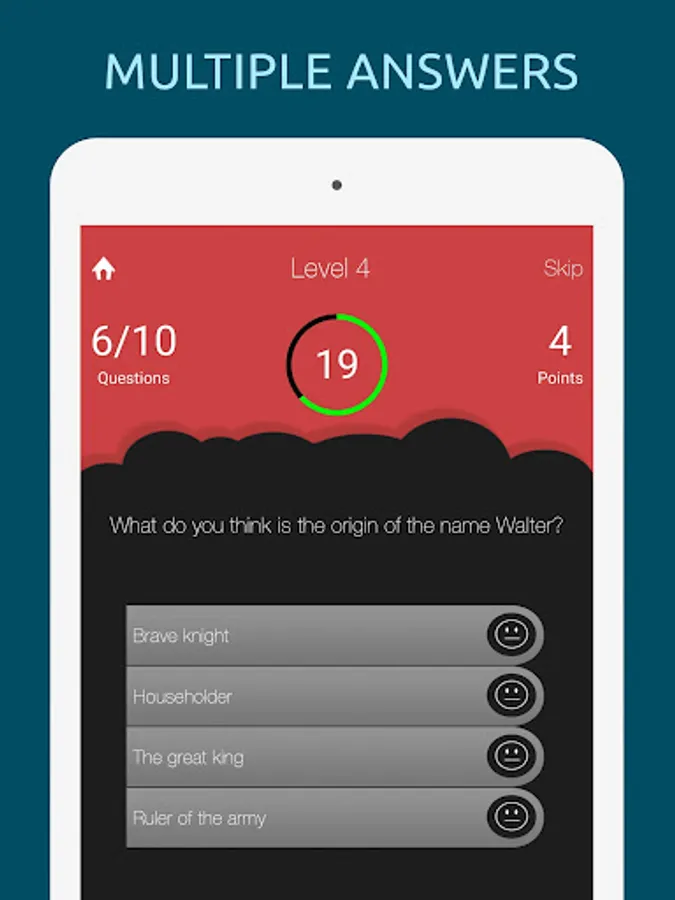 Trivia questions and answers are shuffled randomly every time you play. You can skip a question, if you don't know the answer. Play multiplayer one on one with your friends!