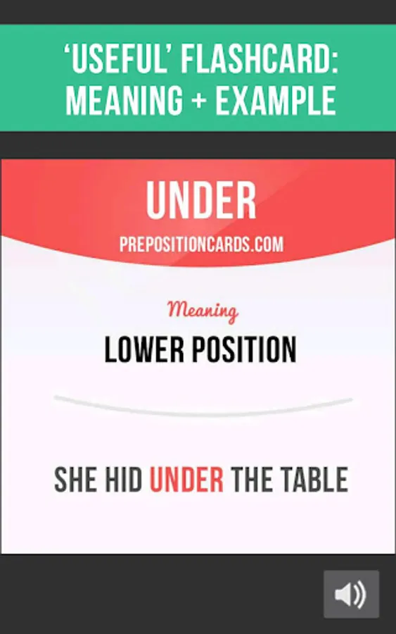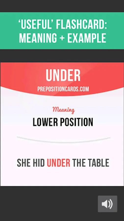 1. 'Useful' flashcard shows you a preposition, its meaning and an example.