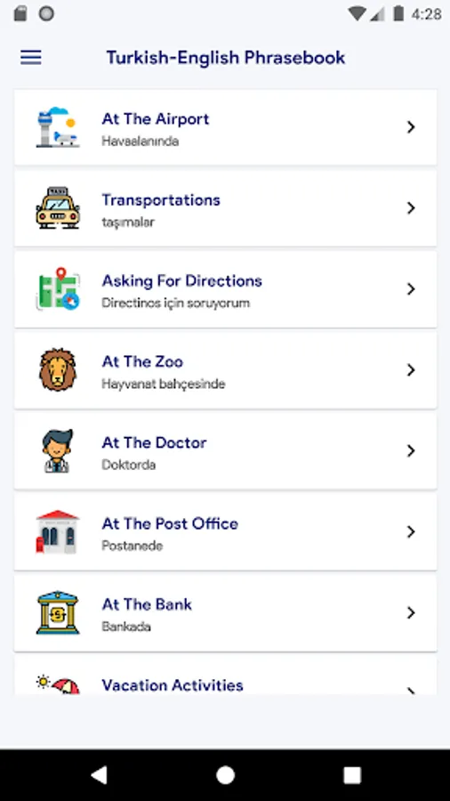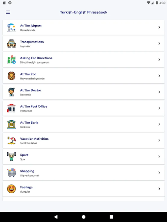Travel topics: at the airport, at the hotel, at the restaurant, transportation, asking for directions, at the hospital, at the bank, shopping, vacation activities, and more.