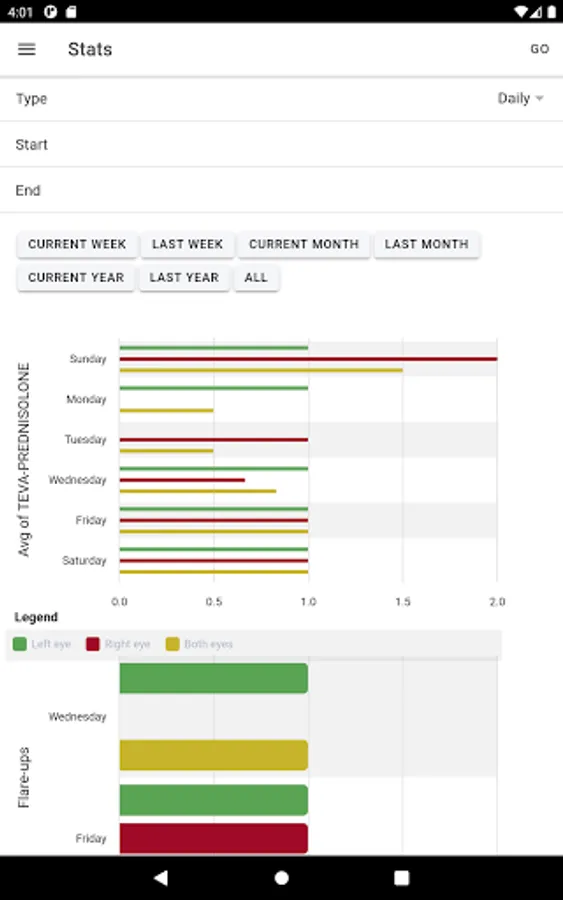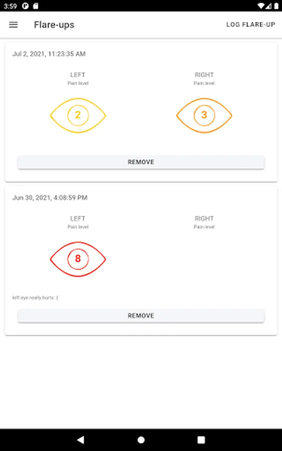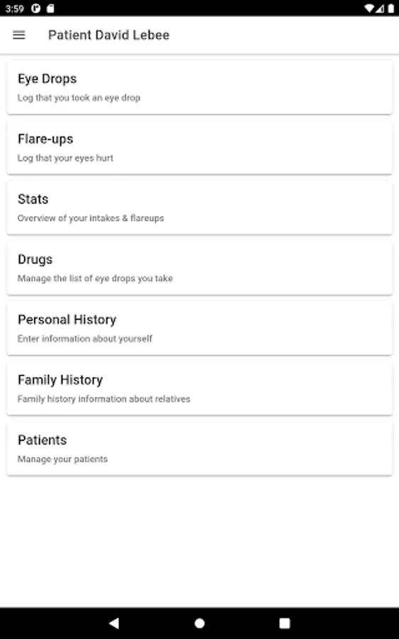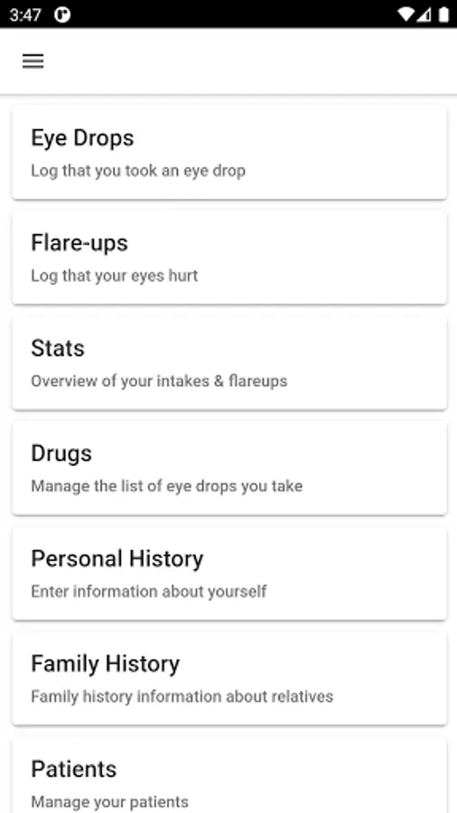 Built for patients suffering from Thygeson by a Thygeson patient to track their drop intakes, flareups, and census the genetic origins of the disease with hopes of gathering statistics to encourage research towards a cure or safer treatments.