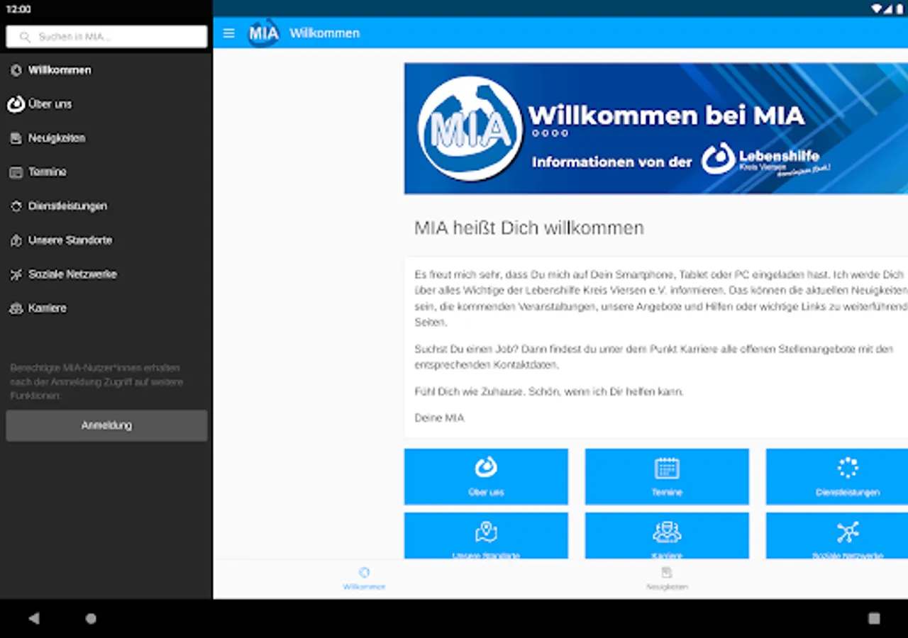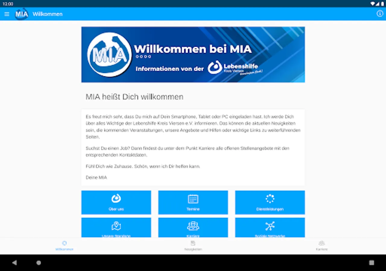Stay in touch with us and find out more about your Lebenshilfe Kreisvereinigung. MIA offers you the opportunity to find out about current dates, interesting projects and much more about the Lebenshilfe Kreis Viersen e.V. - mobile, fast and up-to-date.