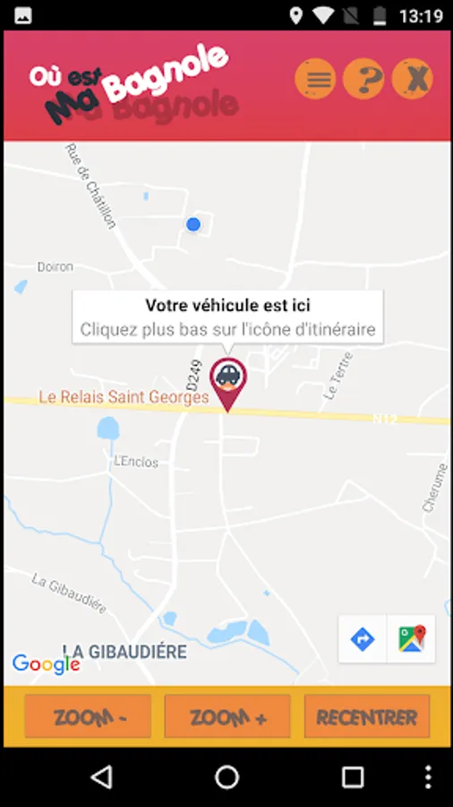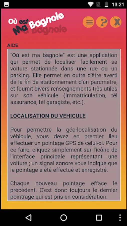"Where is my car" is an application that makes it easy to locate your car parked on a street or parking lot. No matter where you are, a precise route is provided from your location to the location of your vehicle.